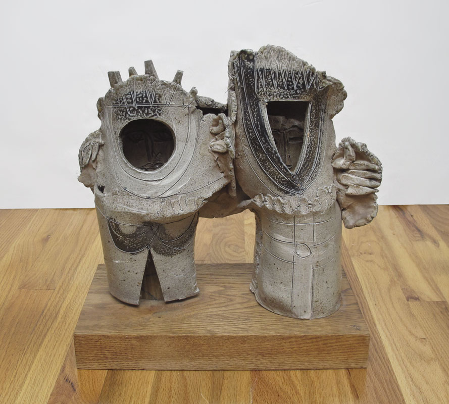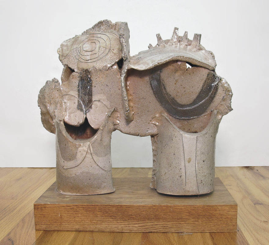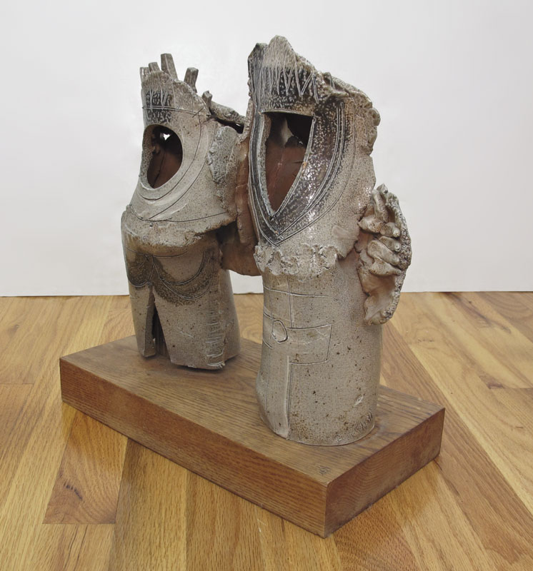 NOSTI, Harold, (American, 20th C.): Abstract Man and Woman, Glazed and Fired Clay, 12 1/2'' h. x 14 1/2'' w., rests on 2'' wood pedestal, incised signature. Harold Nosti is a graduate of the University of Tampa, and was a professor of art there for many years. He has exhibited at the Polk County Museum of Fine Arts, and the Tampa International Airport, among others.