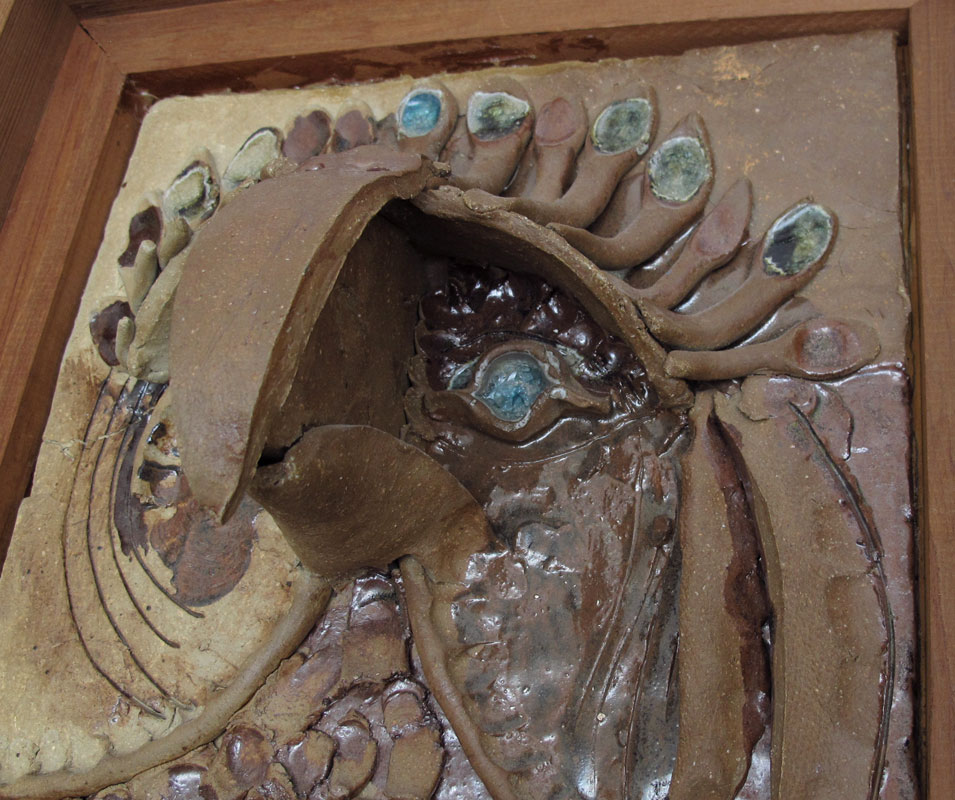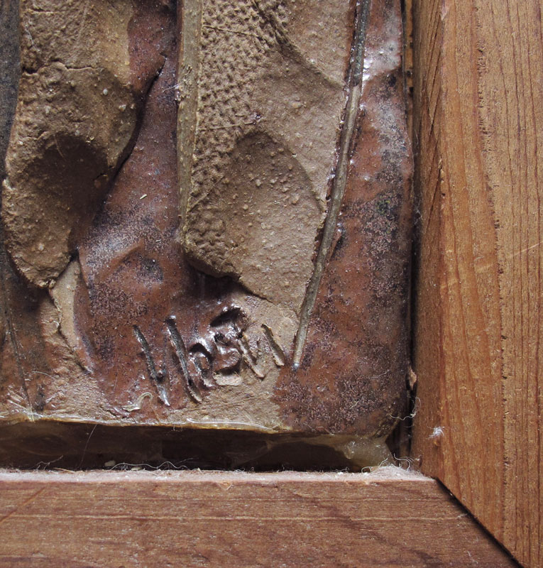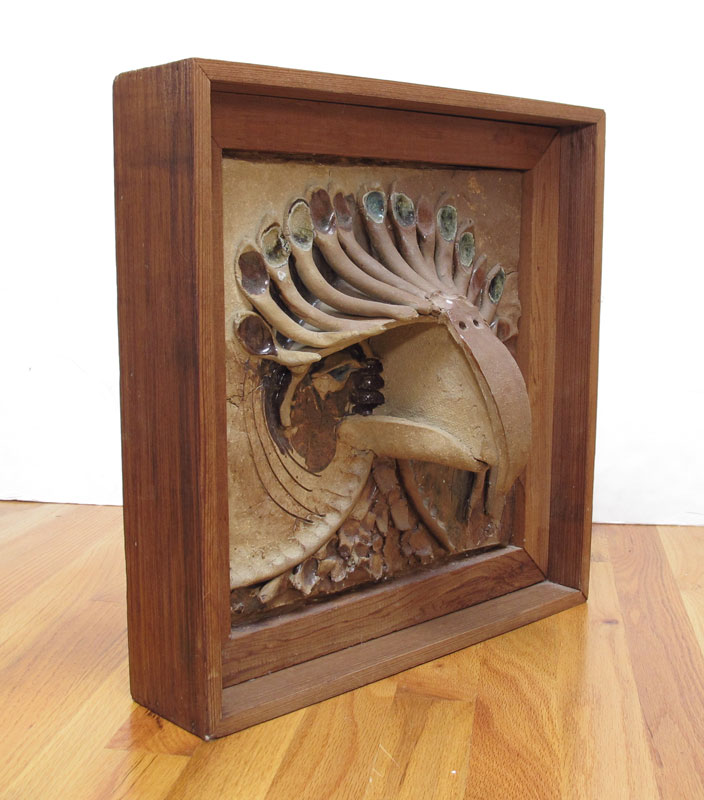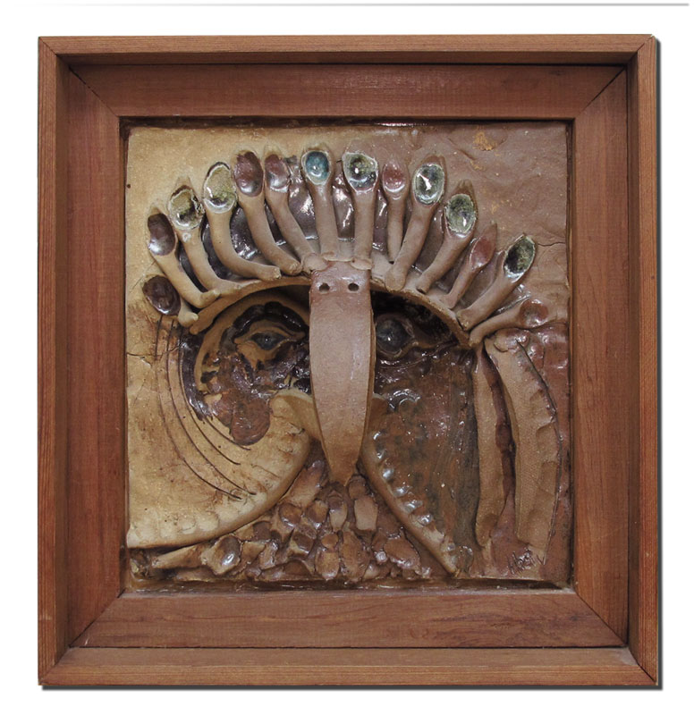 NOSTI, Harold, (American, 20th C.): ''Persian Hawk'', Framed Glazed and Fired Clay, 12'' x 12'', incised signature, wooden frame, 17'' x 17''. Harold Nosti is a graduate of the University of Tampa, and was a professor of art there for many years. He has exhibited at the Polk County Museum of Fine Arts, and the Tampa International Airport, among others.