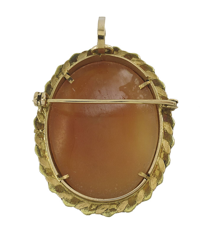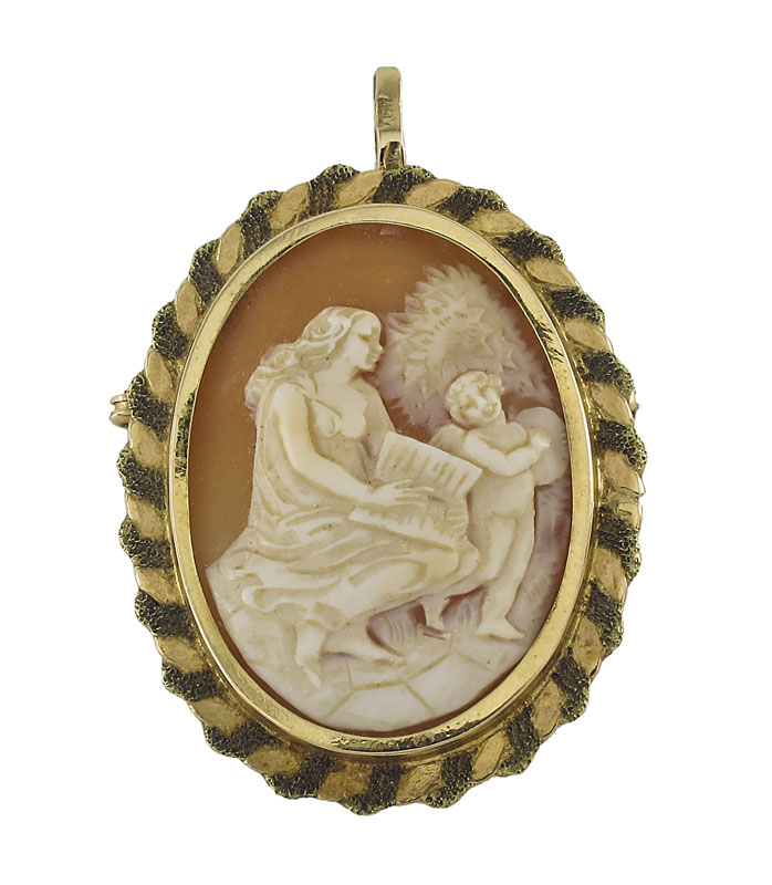 18K FRAMED CARVED SHELL CAMEO BROOCH PENDANT: 18K yellow gold brooch / pendant contains one oval shell cameo depicting a muse and cherub. Bar pin and bail. Weight: 10.2 grams Approx. 1.5'' x 1.25''.