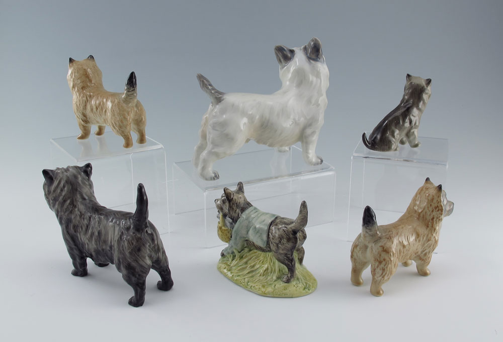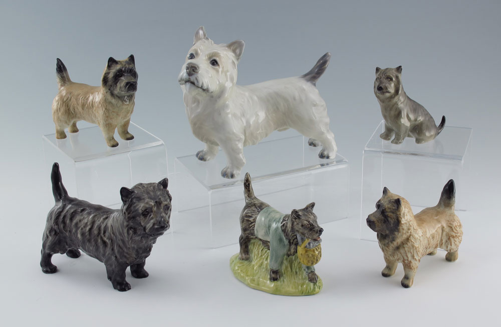 6 PIECE PORCELAIN TERRIER DOG GROUPING: 6 dogs to include Dahl Jensen, Beswick, Beatrix Potter and Royal Copenhagen. Largest measures 4 1/2'' h. x 5''.