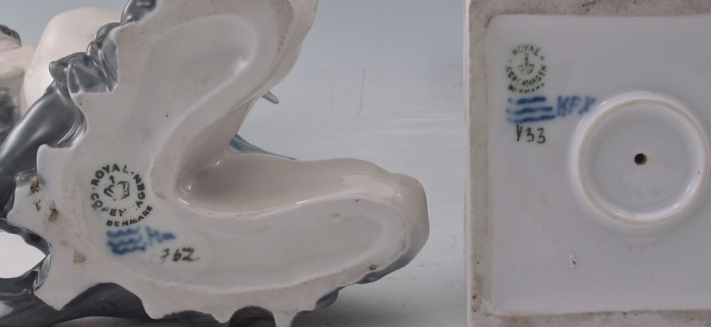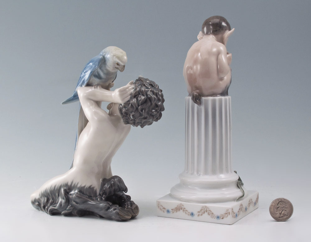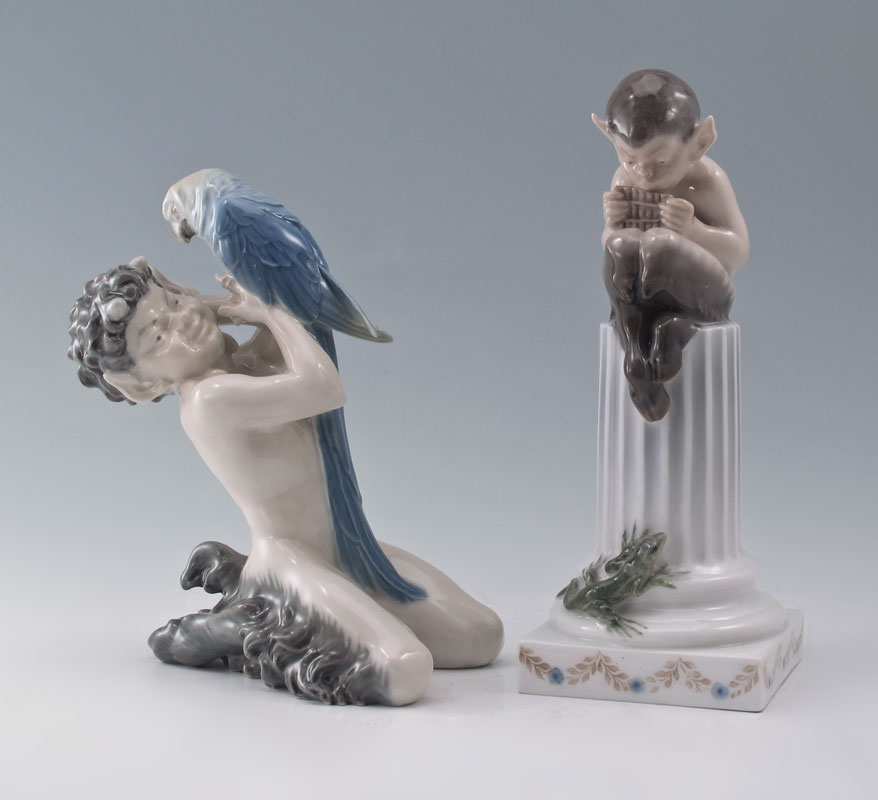 TWO ROYAL COPENHAGEN FAUN FIGURES: 1) #752 Faun with Parrot, 7'' tall. 2) #433, Faun with Lizard, 8 1/4'' tall.