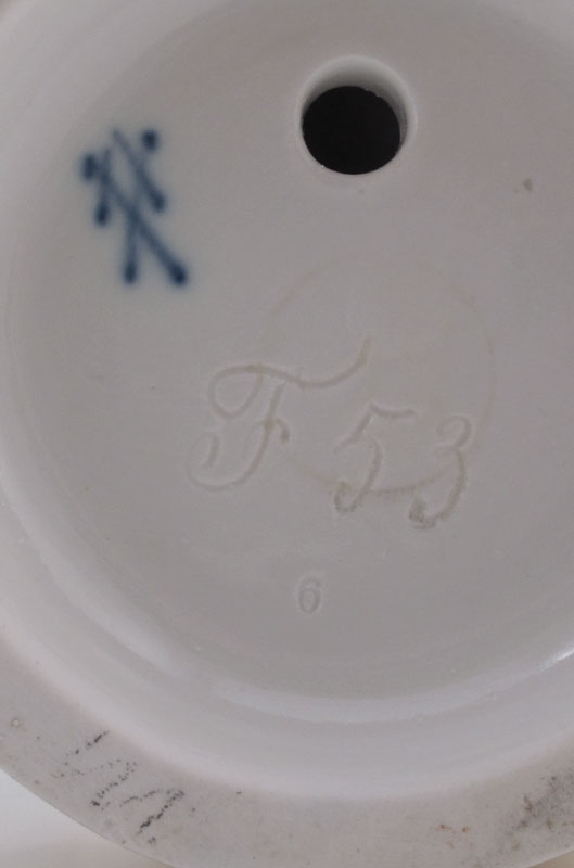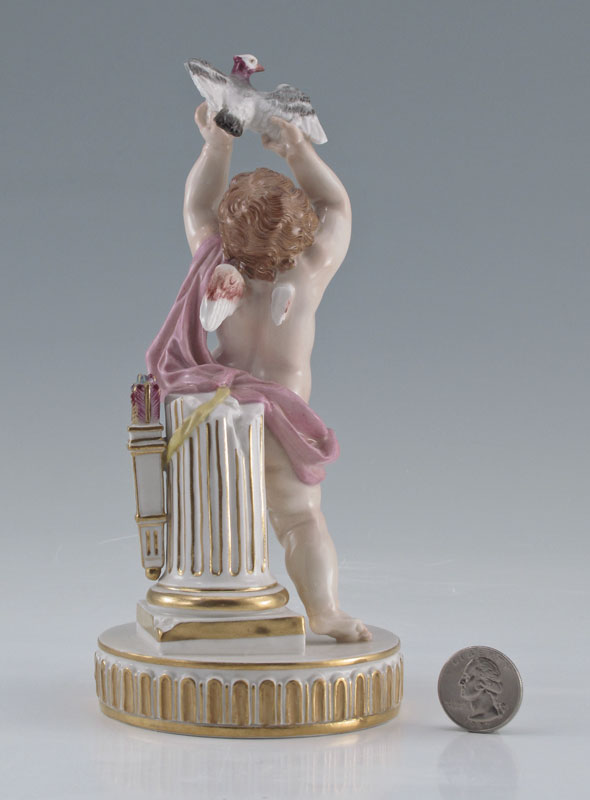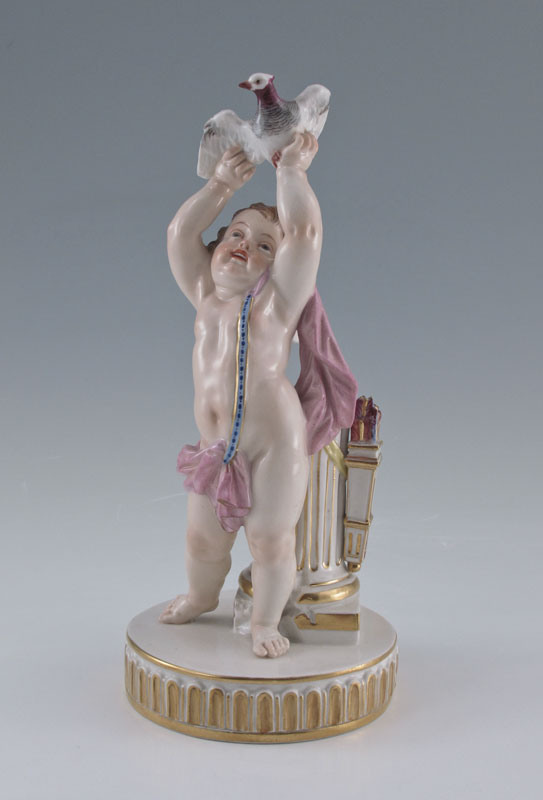 MEISSEN PORCELAIN FIGURE OF CUPID: Finely detailed figure of cupid with arrows in waiting, arms raised to send off a bird. Crossed sword mark, 8'' tall, the round base 3 1/2'' dia.