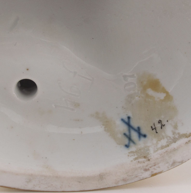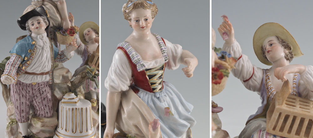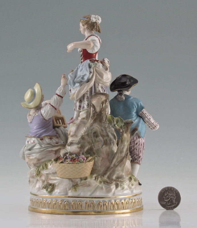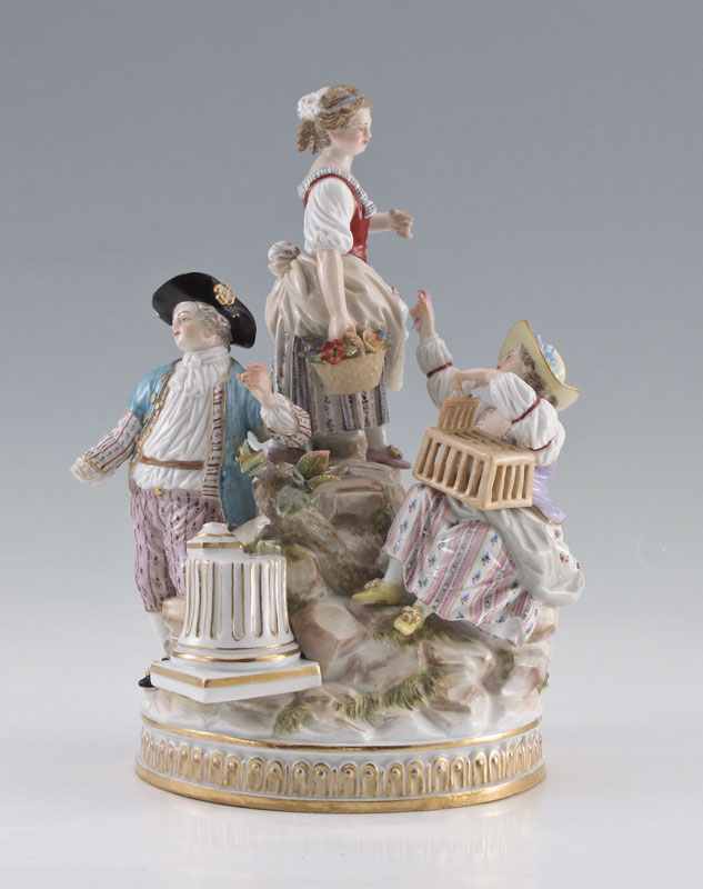 MEISSEN PORCELAIN FIGURAL GROUP: Three figures on a steep rocky base. Blue cross swords under glaze. 8 1/2'' X 4 1/2''.
