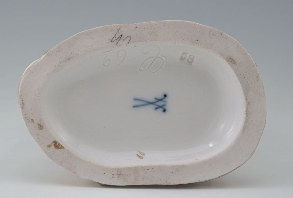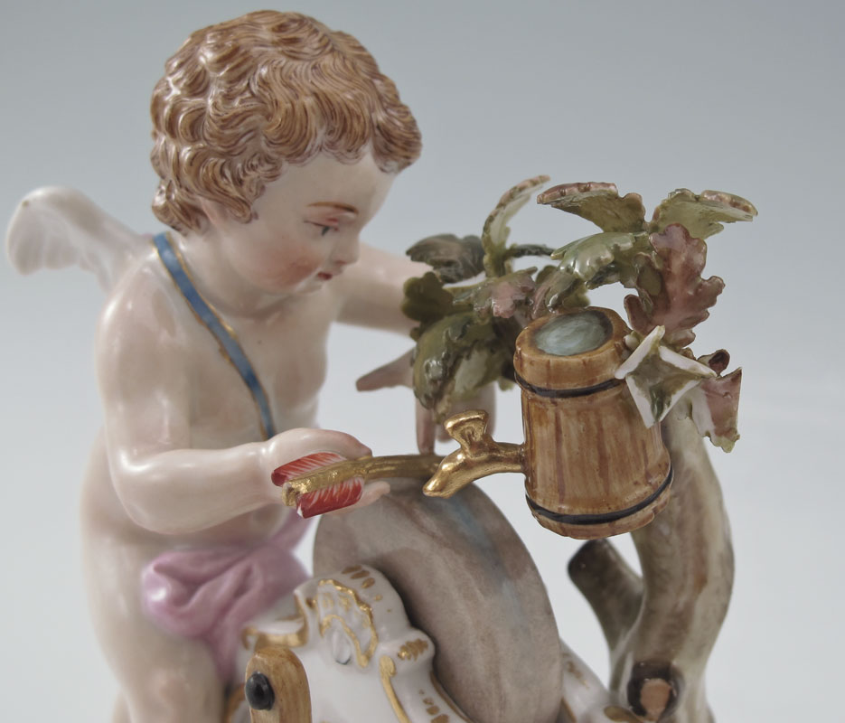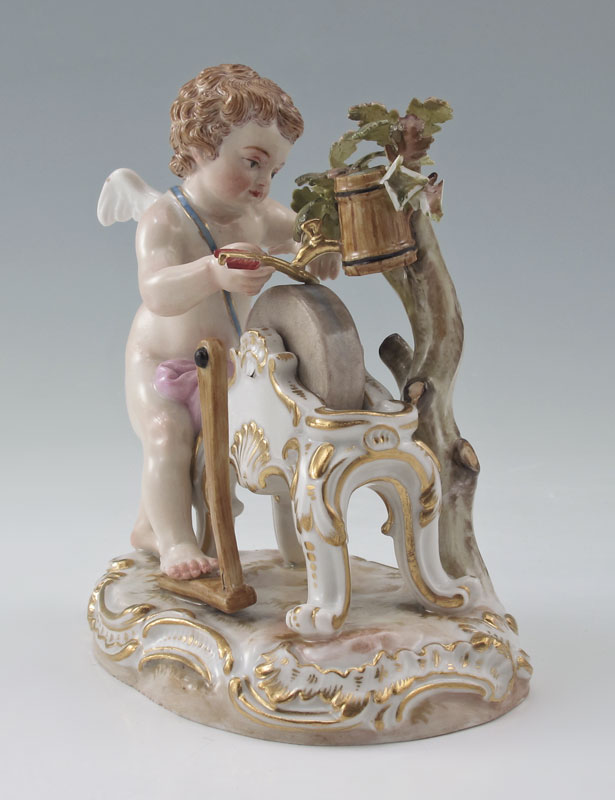 MEISSEN PORCELAIN FIGURE DEPICTING CUPID SHARPENING HIS ARROWS: 4 3/4'' tall x 4''.