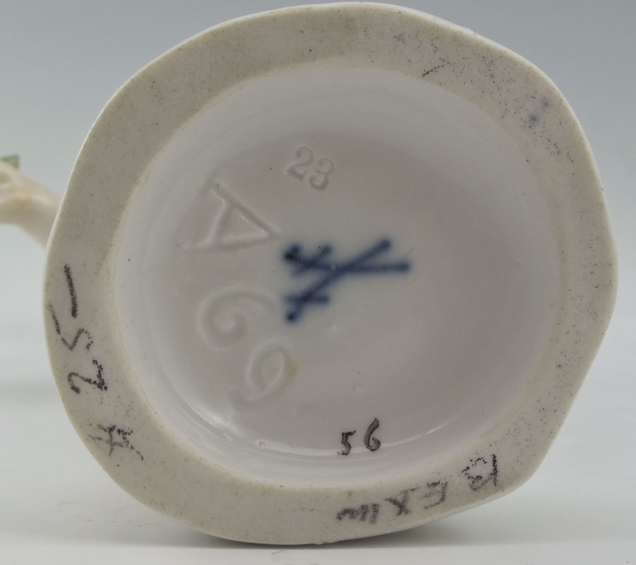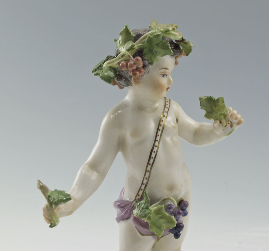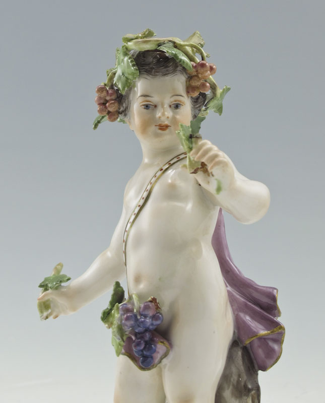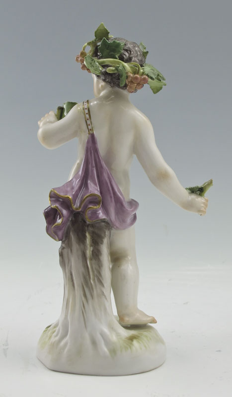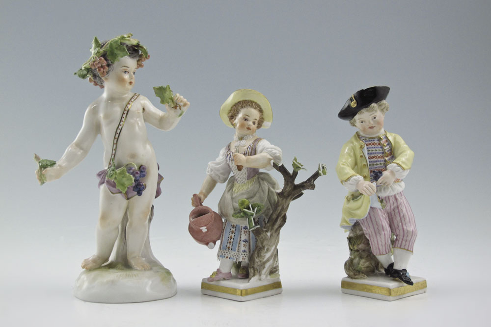 GROUP OF 3 MEISSEN PORCELAIN FIGURES: Bacchanalian child, 5'' tall. Sold with the pair of garden figures, 4 1/4'' tall. All with the Meissen cross swords mark.