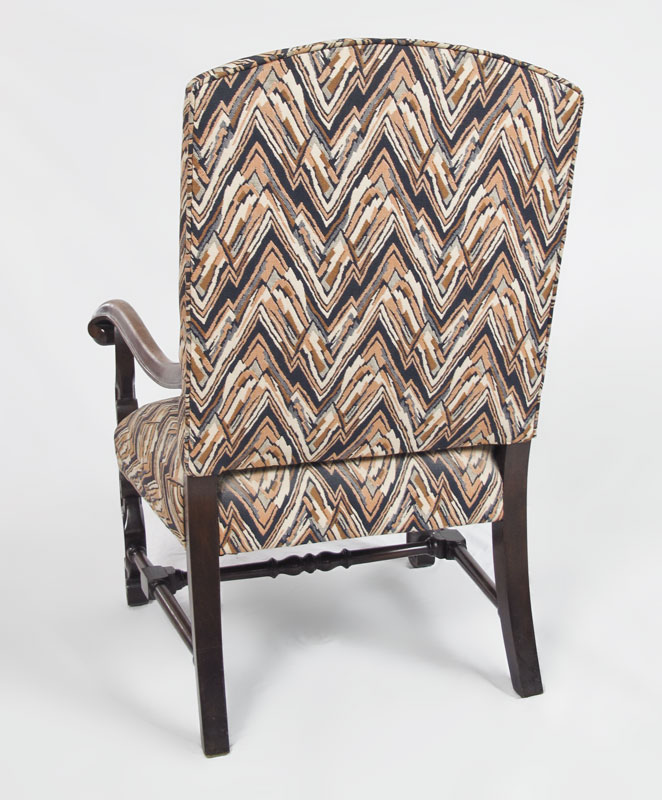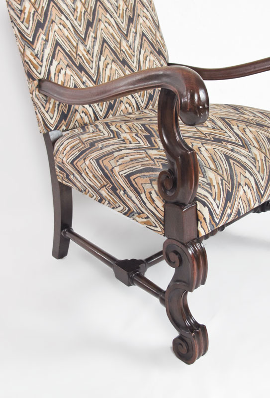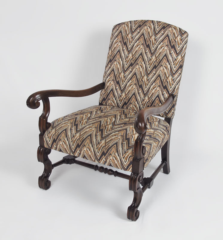 LOUIS XVI STYLE WALNUT ARM CHAIR: Arched upholstered back and seat, curved arms ending in scroll grips, the curved legs ending in scroll feet. Legs joined by turned stretcher. 40''h. x 30'' x 29''.