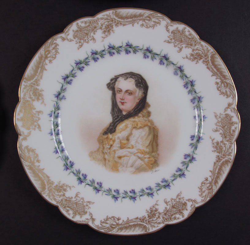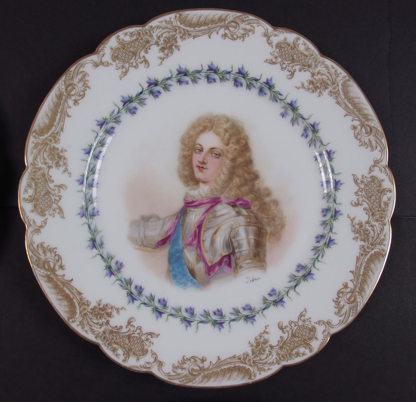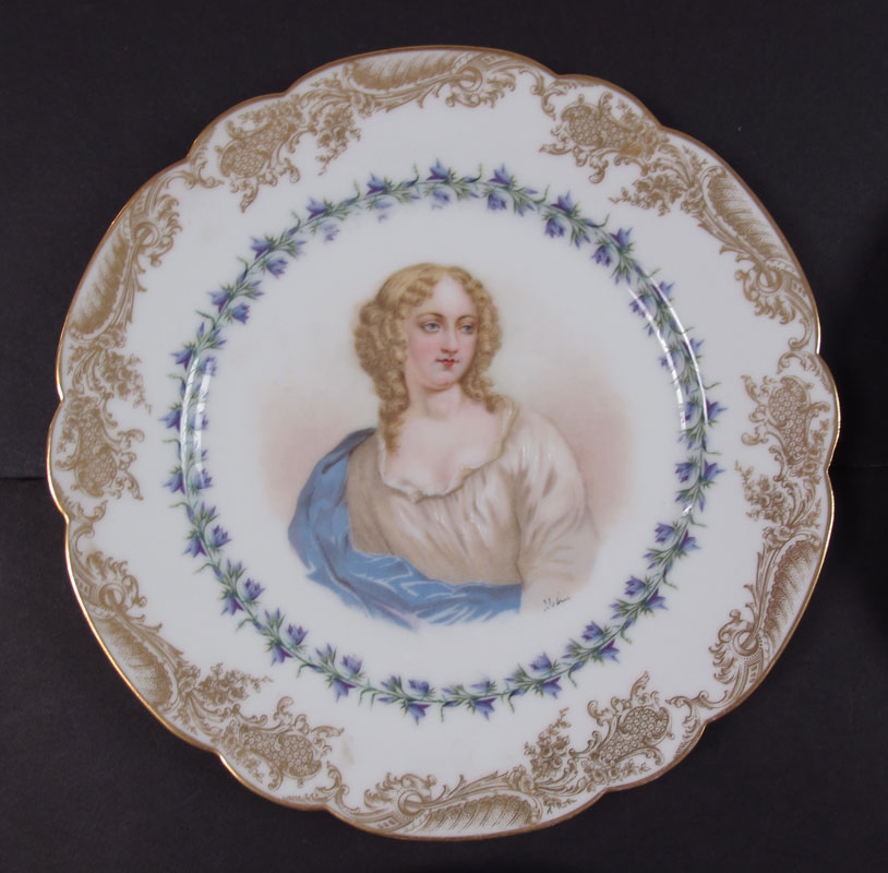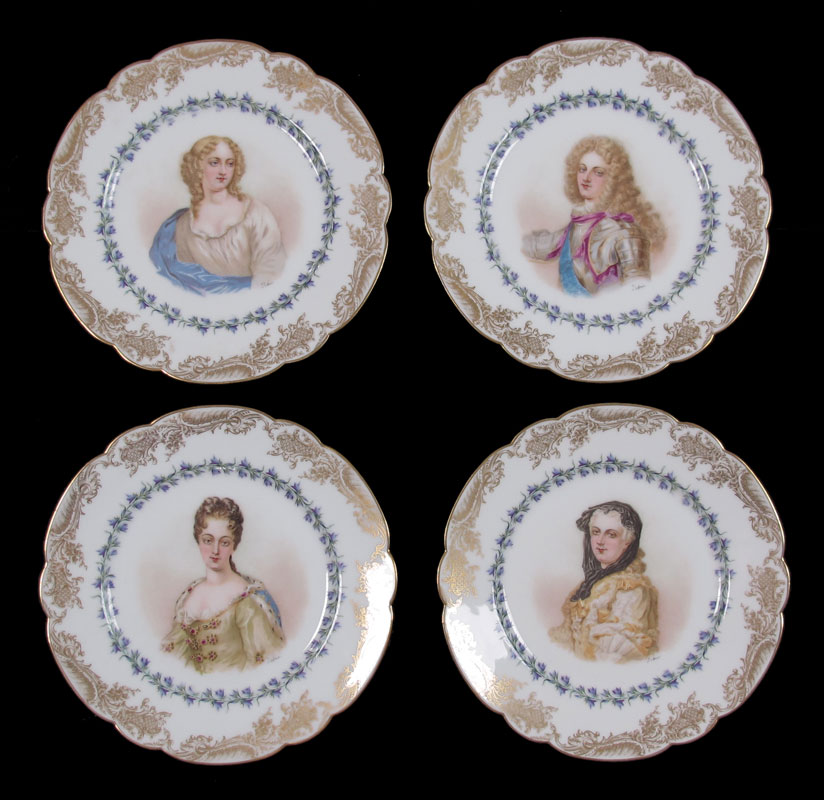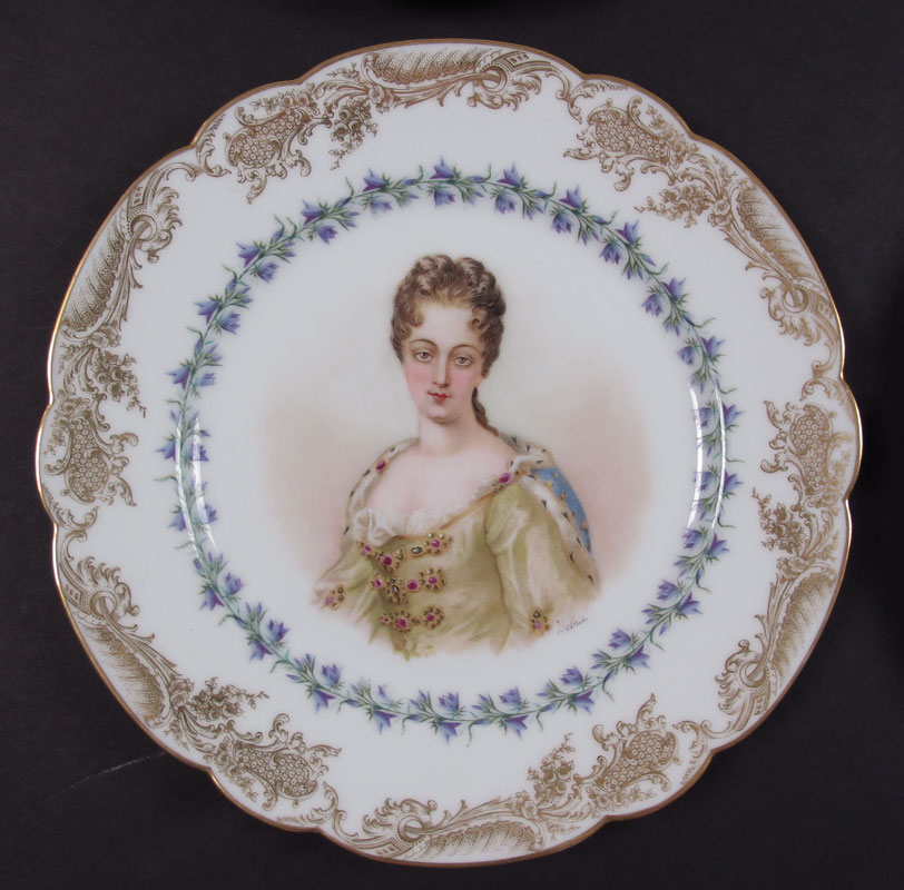 SET OF 4 SEVRES CHATEAU ST. CLOUD PORTRAIT PLATES: Matched set with lacy gilt border, each portrait is framed in violet flowers. Madame de Lavalliere, Louis de France Duc de Bourgogne, and Duchesse de Bourgogne, and Marie Leczinska. 9 1/2'' dia.