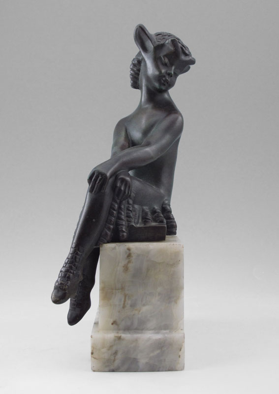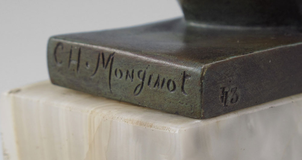 PATINATED BRONZE SHY YOUNG SATYR SIGNED CH. MONGINOT: Seated figure rests on a white marble plinth, bronze is 9'', with plinth 10 1/2'', some minor wear to base.