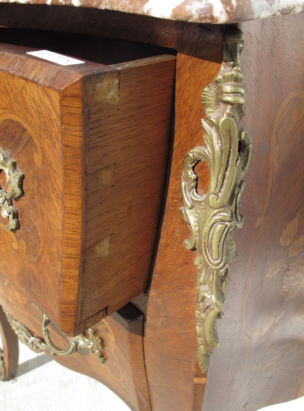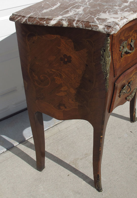 FRENCH MARBLE TOP INLAID TWO DRAWER STAND: Marble top over shaped 2 drawer base with floral inlay on drawers and sides. Cast metal mounts and hardware. 33 1/4'' h. x 27 1/2'' x 15''.