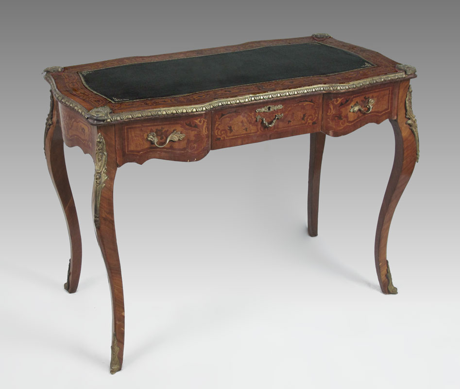 FRENCH ORMOLU LEATHER TOP WRITING TABLE: Leather inset with marquetry inlay rim shaped top. Inlaid single drawer and skirt, cast ormolu mounts and decoration. 32 1/2'' h. x 43 3/4'' x 23 3/4''.