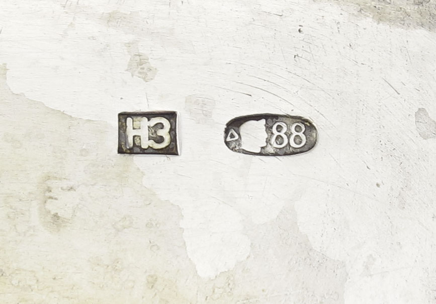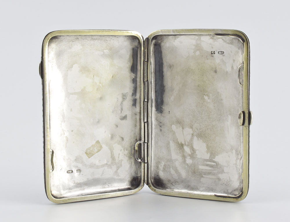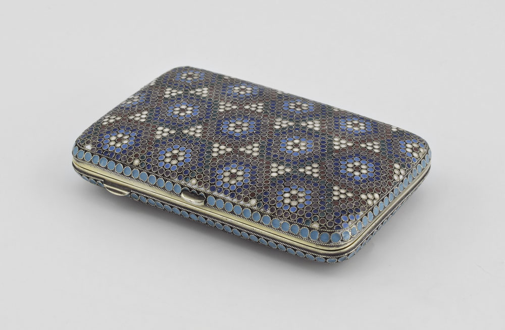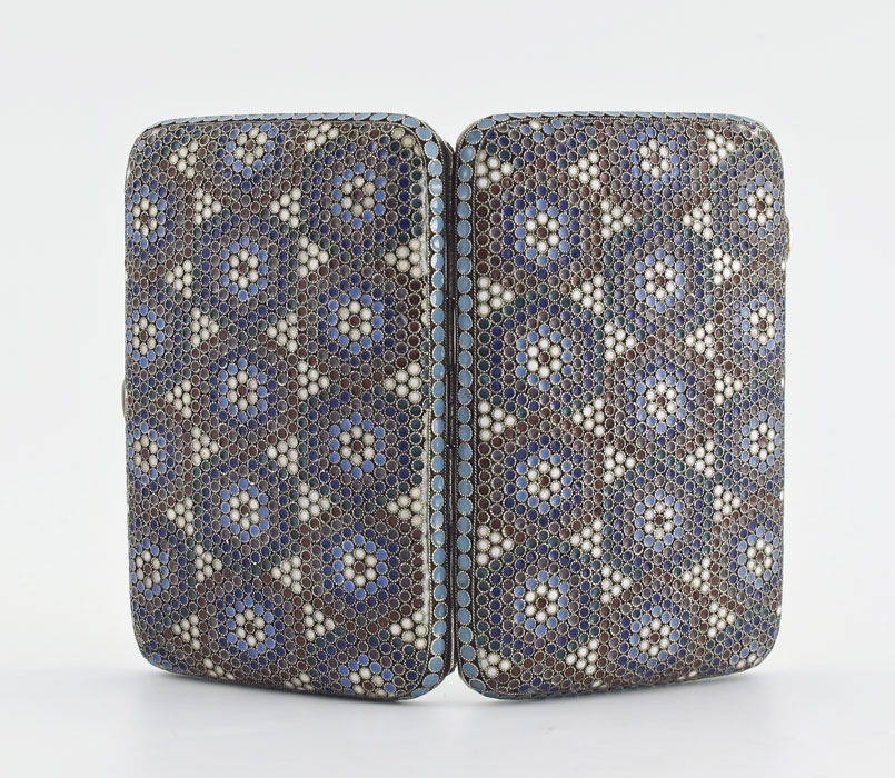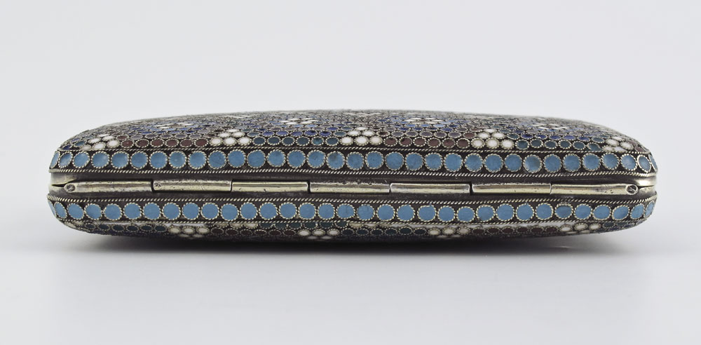 N. ZVEREV RUSSIAN SILVER ENAMEL CARD CASE: Russian silver enameled card / cigarette case with repeating geometric design, hallmarked with N. Zverev hallmark, Moscow 88 zolotnik. Push button clasp. 4 1/4'' x 2 3/4''.