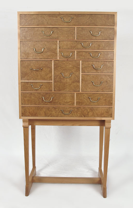 JOSEF FRANK CHEST OF DRAWERS: Manufactured by Svenskt Tenn. 14 drawer chest raised on tall tags, 55 1/4'' tall x 28'' x 15''.