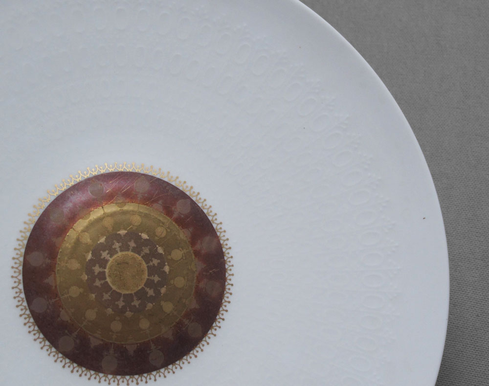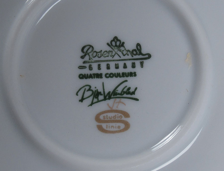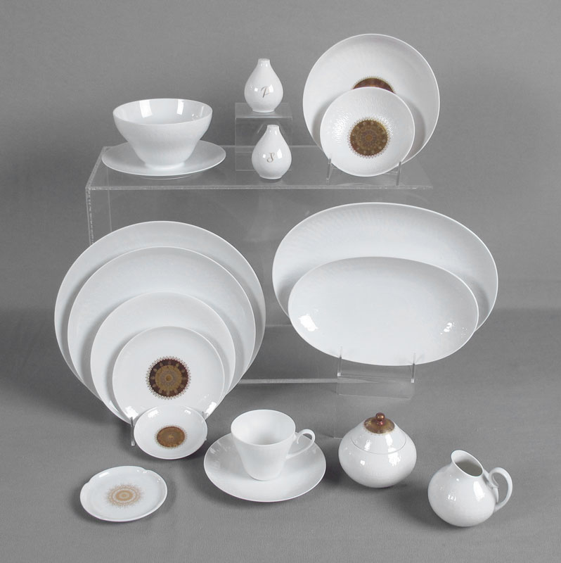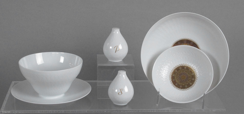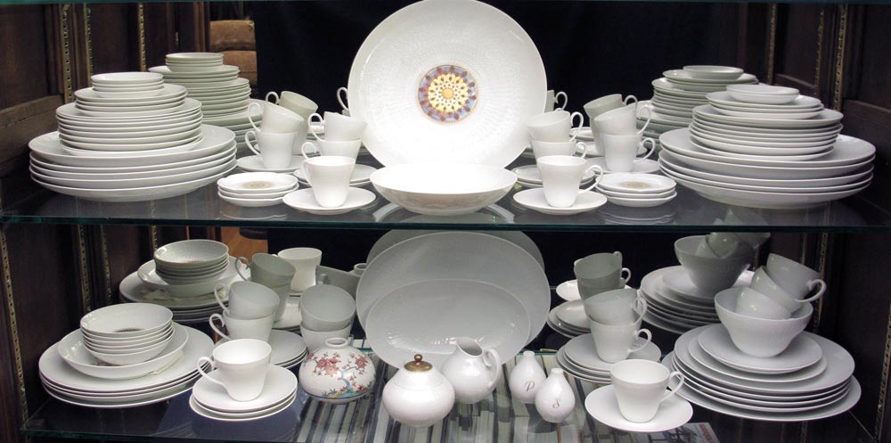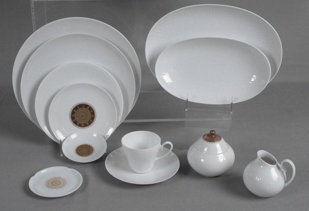 ROSENTHAL FINE CHINA STUDIO LINE BJORN WIINBLAD QUATRE COULEURS: Approx. 113 pieces, mixed Quatre Couleurs and embossed white. The Quatre Couleurs include 12 dinner plates (11'' dia.), 8 bread plates, sugar, 6 butter pats, and 6 desert bowls. The all white embossed include 8 plates (9 3/4''), 16 plates (7 1/2''), 8 bread plates, 11 cups, 11 saucers, 10 demi-tasse, 10 saucers, 2 soup bowls, and 11 1/2'' platter, 9 1/2'' platter, gravy, cream pitcher, and the salt and pepper shakers.