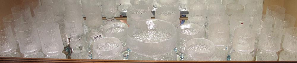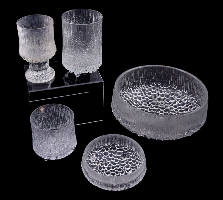 TAPIO WIRKKALA ULTIMA THULE GLASSWARE FOR IITTALA FINLAND: 35 pieces to include a 7 1/2'' serving bowl, 8 individual bowls, 12 on the rocks tumblers (3 1/2''), 8 tumblers (4 3/4''), and 6 footed tumblers, (4 3/4''). Designed by Tapio Wirkkala in 1968, line bead design resembling the icy terrain of Scandinavia.