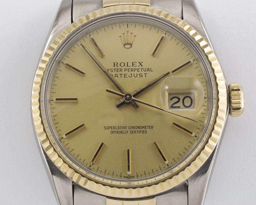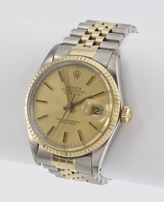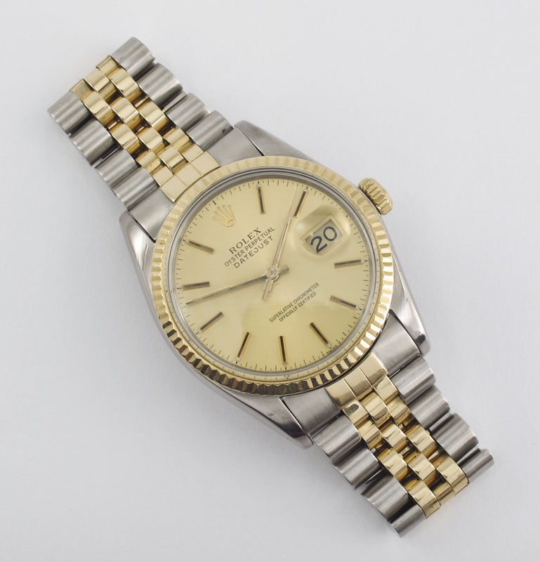 ROLEX OYSTER PERPETUAL TWO TONE WRISTWATCH: 18K yellow gold and stainless steel date just watch with stainless steel case. Case number 16013. Serial number 8228322. The bezel and genuine Rolex crown are 18K. Champagne dial with standard Radium stick style hands, acrylic crystal. 27 jewel movement, caliber .035, serial number 115239, automatic winding. In good running order, pressure tests well for water resistance. CA. 1984.