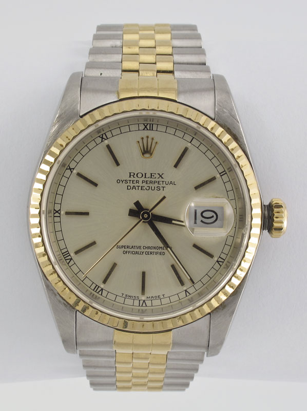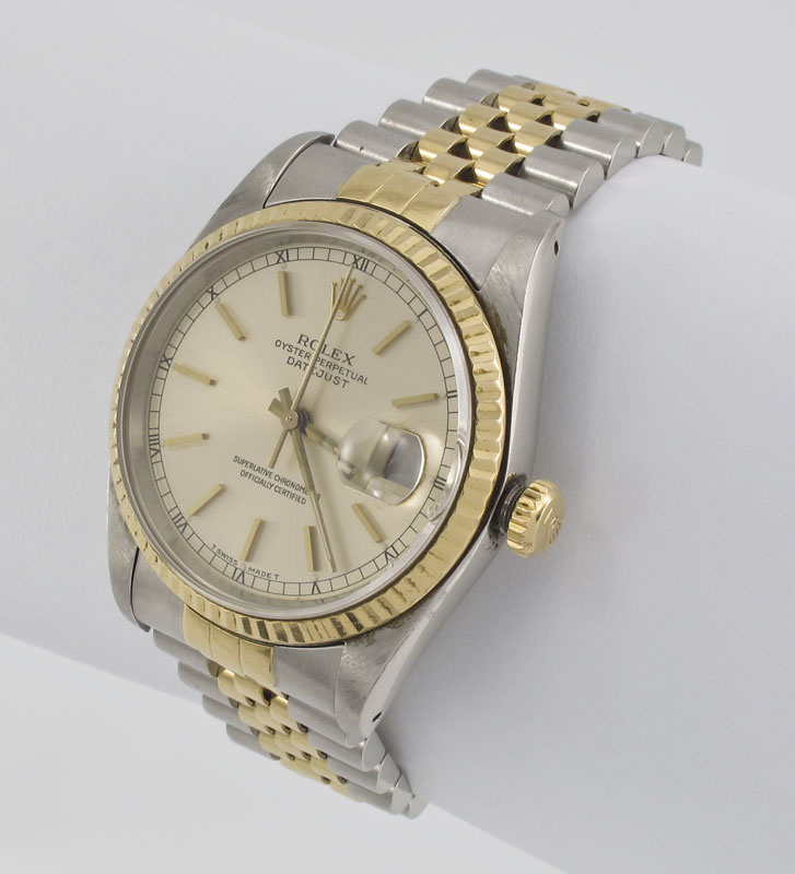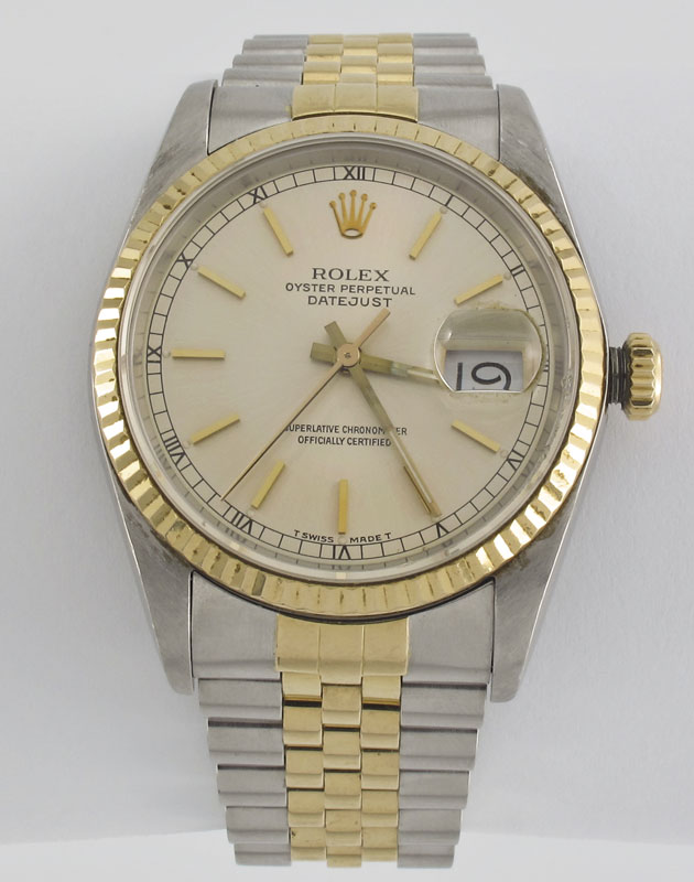 ROLEX OYSTER PERPETUAL TWO TONE WRISTWATCH: 18K yellow gold and stainless steel date just watch with stainless steel case. Case number 16233. Serial number R715838. The bezel and genuine Rolex crown are 18K. Dial with standard Radium stick style hands. 31 jewel movement, caliber 3135, serial number 5179479, automatic winding, sapphire crystal with nicks. In good running order, passed water resistance test.