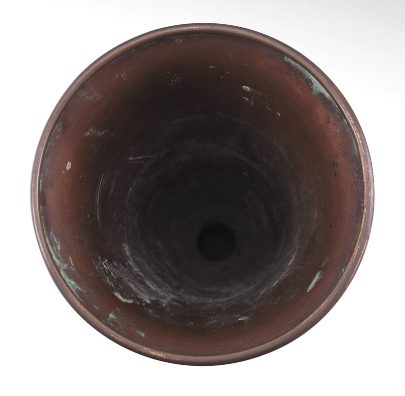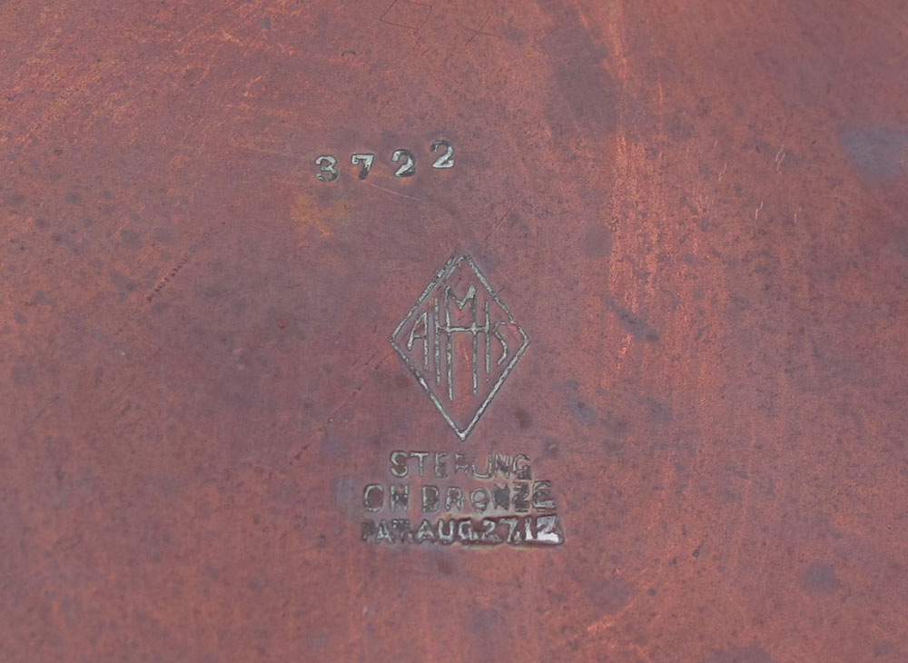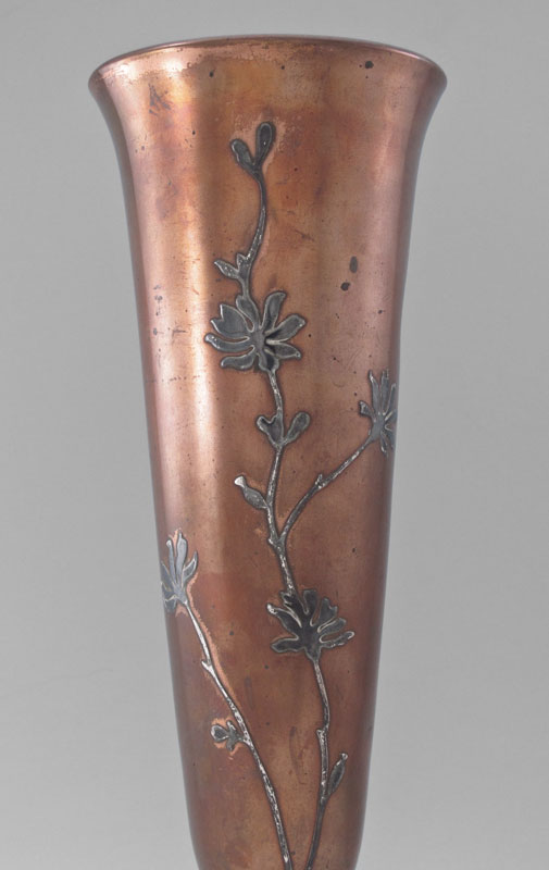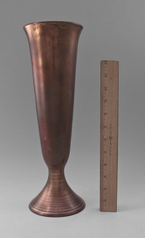 HEINTZ SILVER OVERLAY ART METAL VASE: Heintz Art Metal Shop sterling on bronze floral design, trumpet form vase. Impressed backstamp, number 3722. 15'' tall, 5'' dia. at the base.
