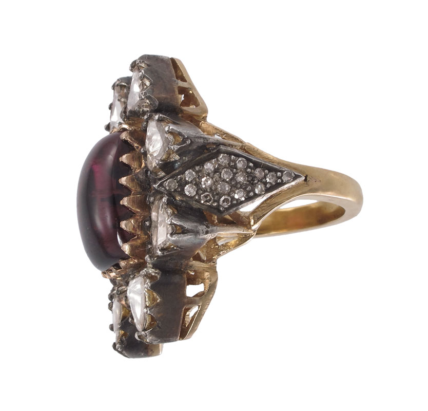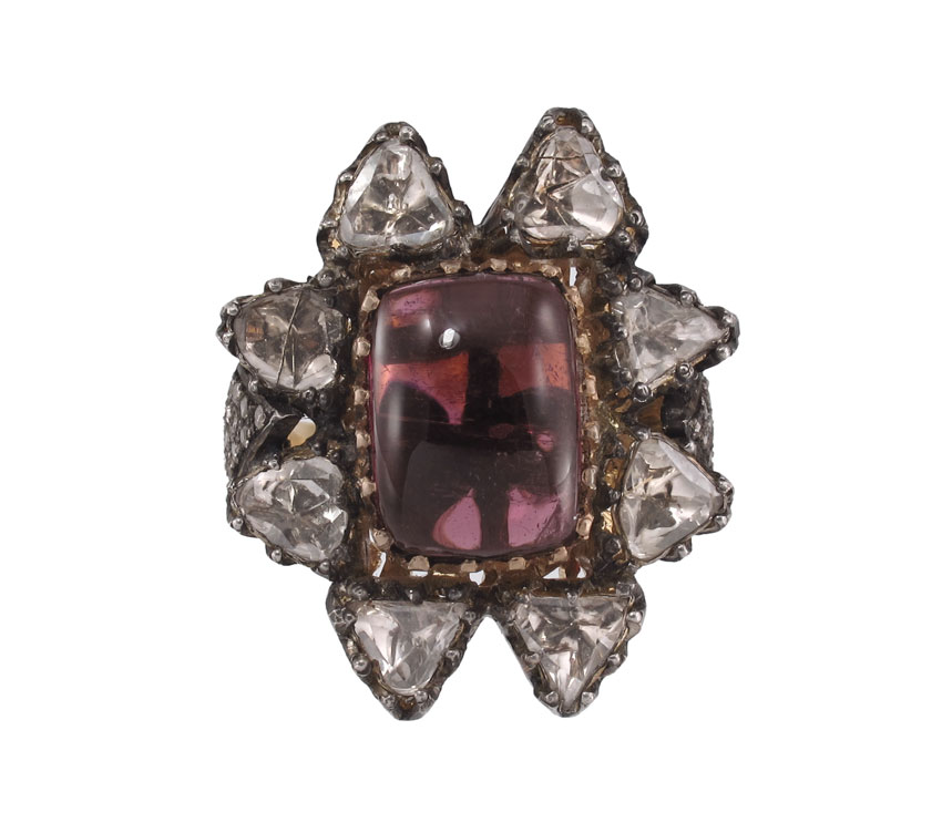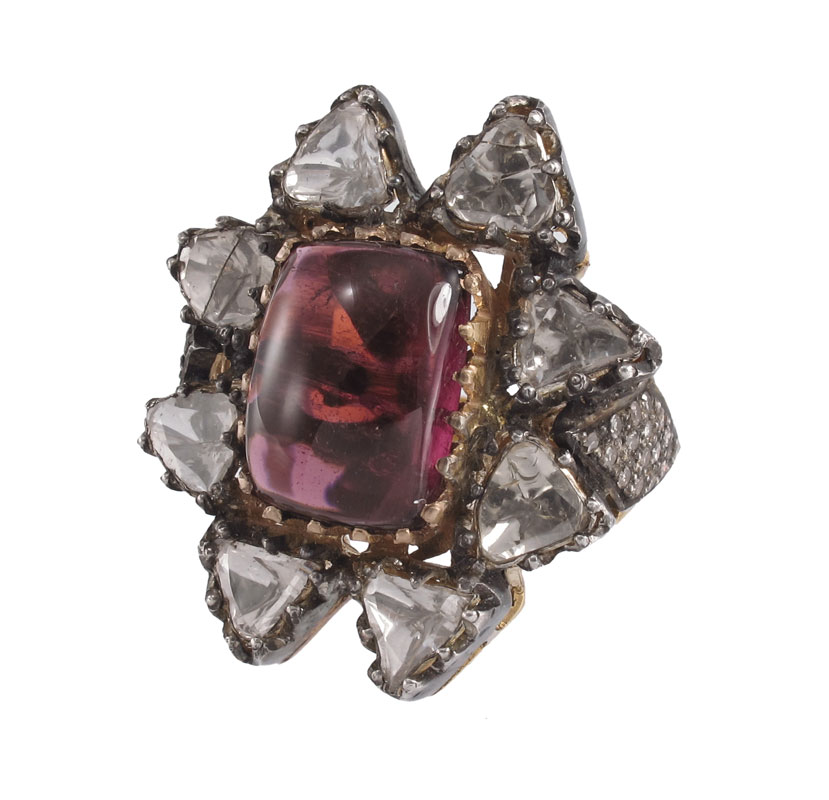 8.60 CT TOURMALINE AND DIAMOND RING: 14K yellow gold and sterling ring centers an approx. 8.60 CT rectangular shaped tourmaline, rated VS in clarity. The tourmaline is framed by 8 triangle shaped diamond tablets (1 cracked) and 34 pave' set round single cut diamonds, approx. 1.75 Ct. The diamonds average SI in clarity and Top Light Brown in color. The tourmaline is prong set. diamond tablets are prong and bezel set. Foil lined cups are beneath the tablets. Size 8.5/ Weight 15.8 grams. Sold with current Florida Diamond Appraisers GIA graduates appraisal for $3,750.