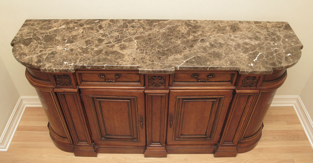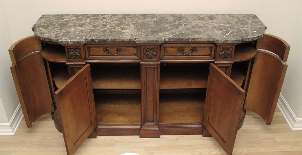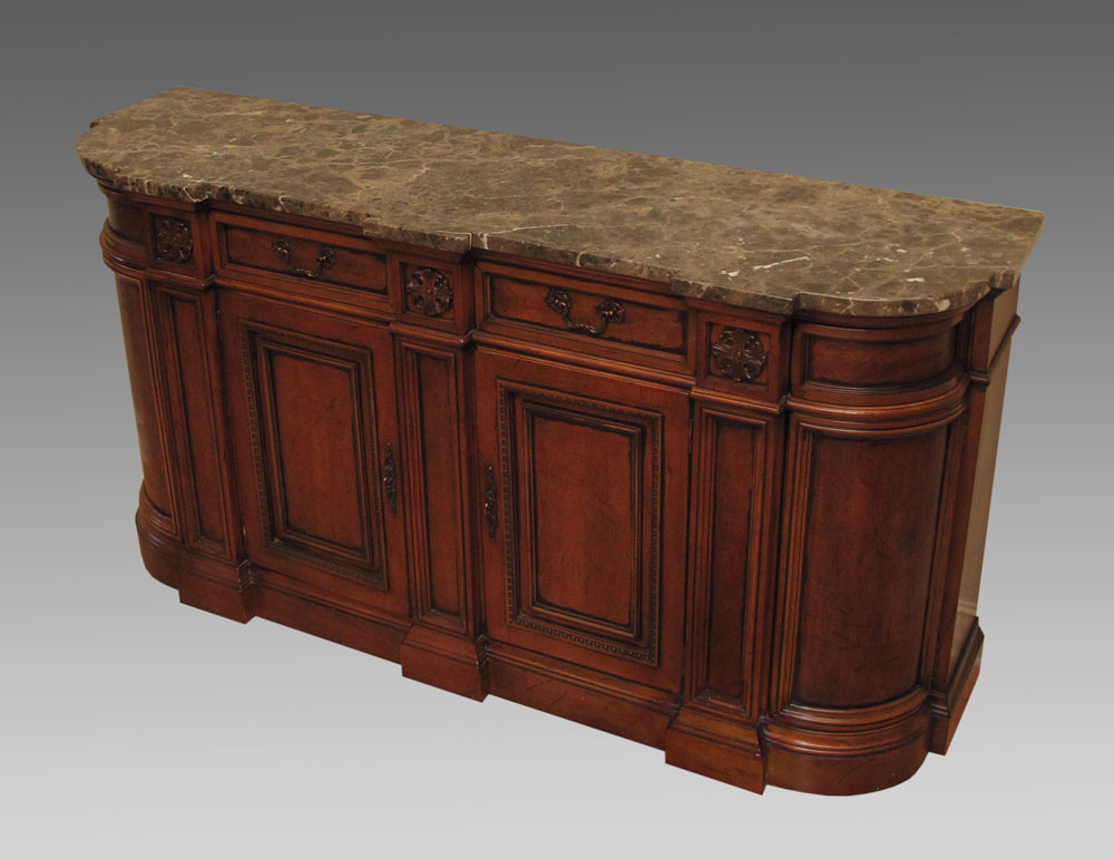 HICKORY CHAIR COMPANY MARBLE TOP BUFFET: Smoky brown variegated marble top. 2 central drawers over 2 doors flanked by upper and lower corner doors. Carved decoration on supports. 39 1/2'' h. x 76'' x 21''.