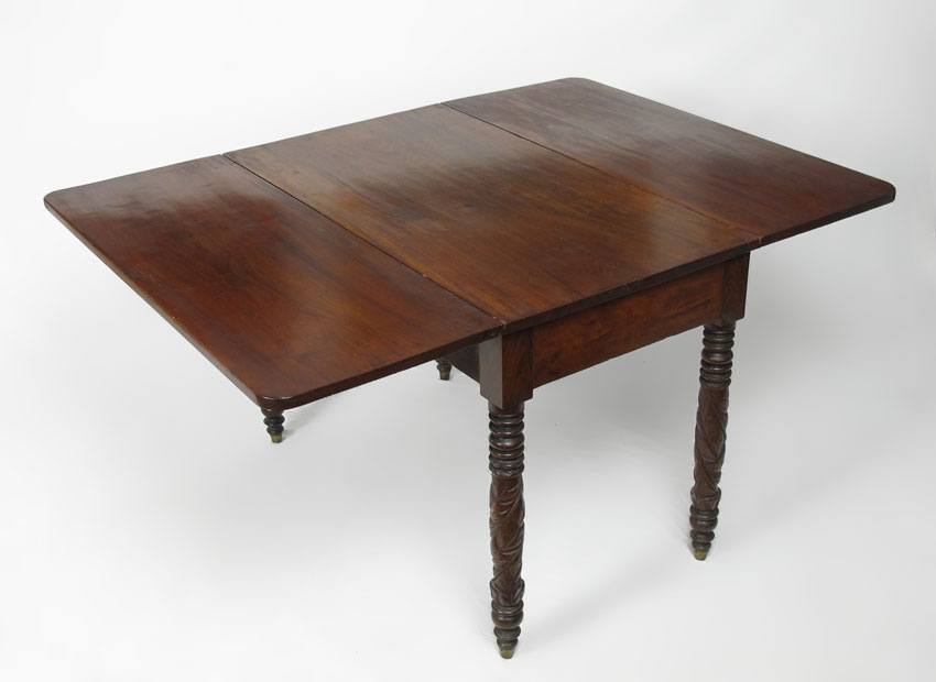 FEDERAL MAHOGANY DROP LEAF TABLE: Mid Atlantic, 19th C. Carved acanthus leaf and carved legs ending in brass cap feet. Approx. 28'' x 40'' x 23'' with leaves down.
