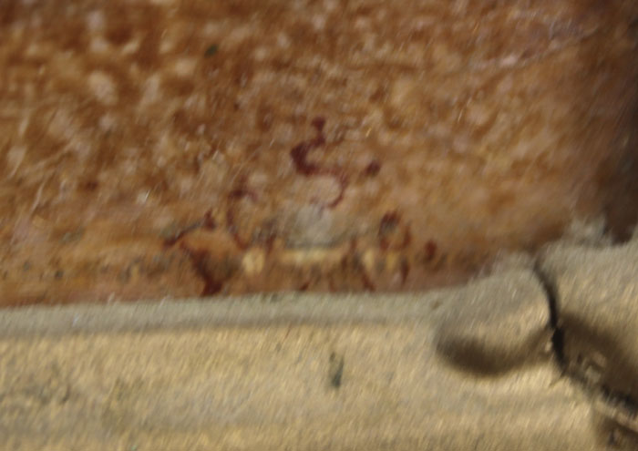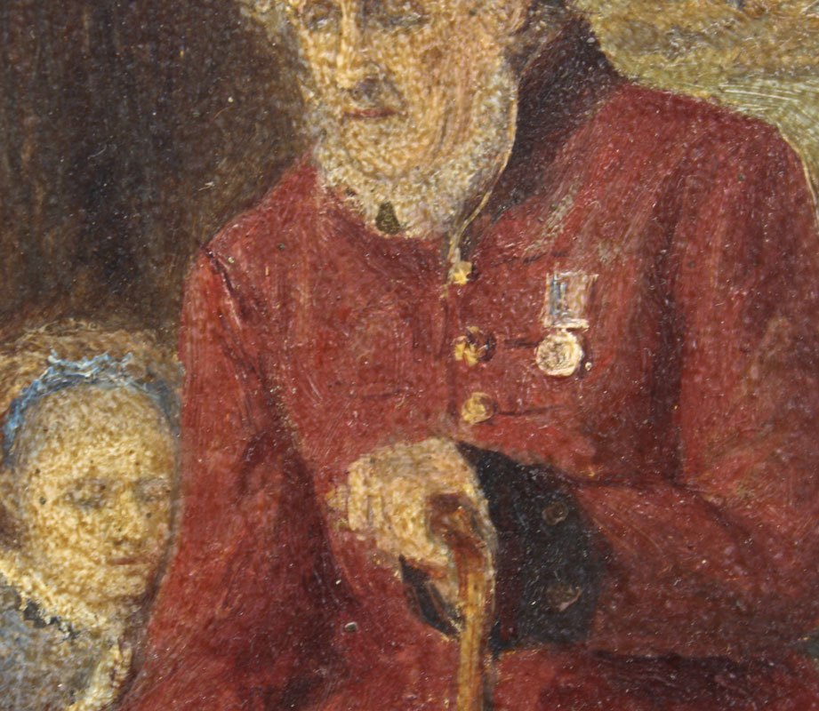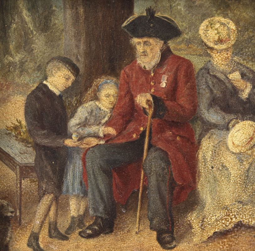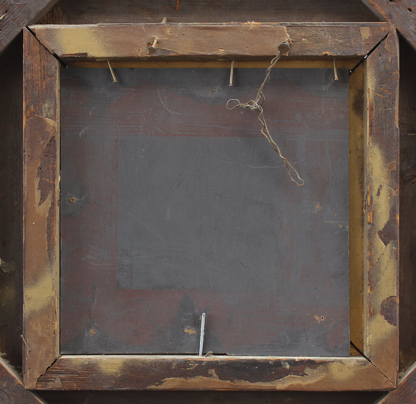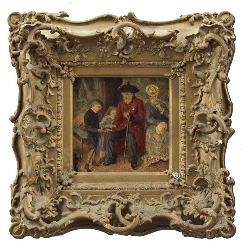 EUROPEAN GENRE PAINTING OF OLD MAN SITTING WITH TWO CHILDREN AND DOG NEARBY: Oil/Board, 7 1/4'' x 7 1/4'', monogrammed lower right 'EGS' and dated 5/97, encased in pierce carved gesso frame with missing gesso and over-paint, 15 1/2'' x 19 1/2''.