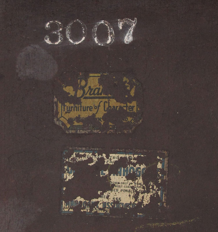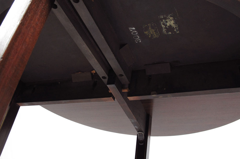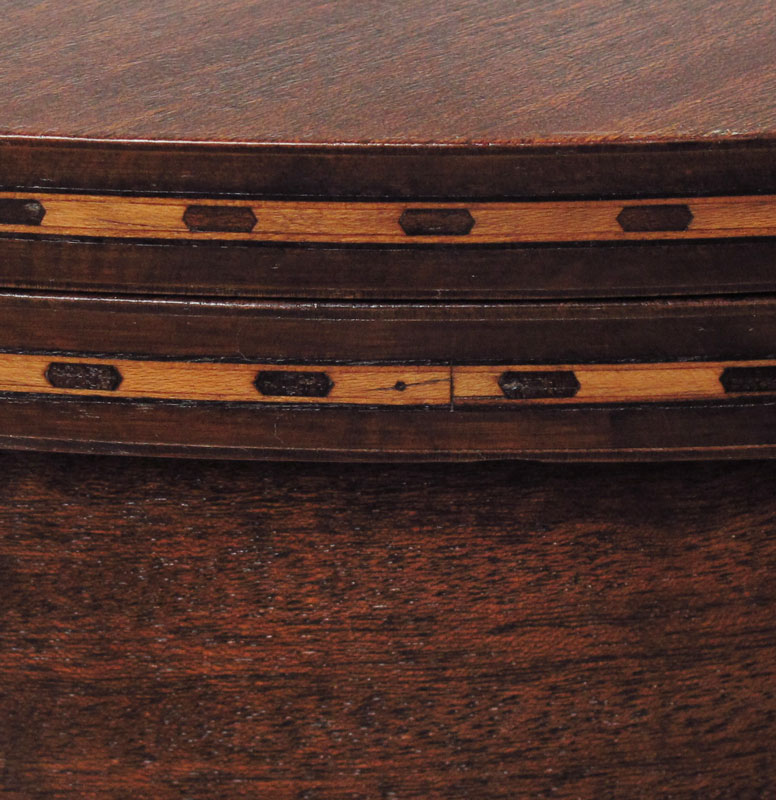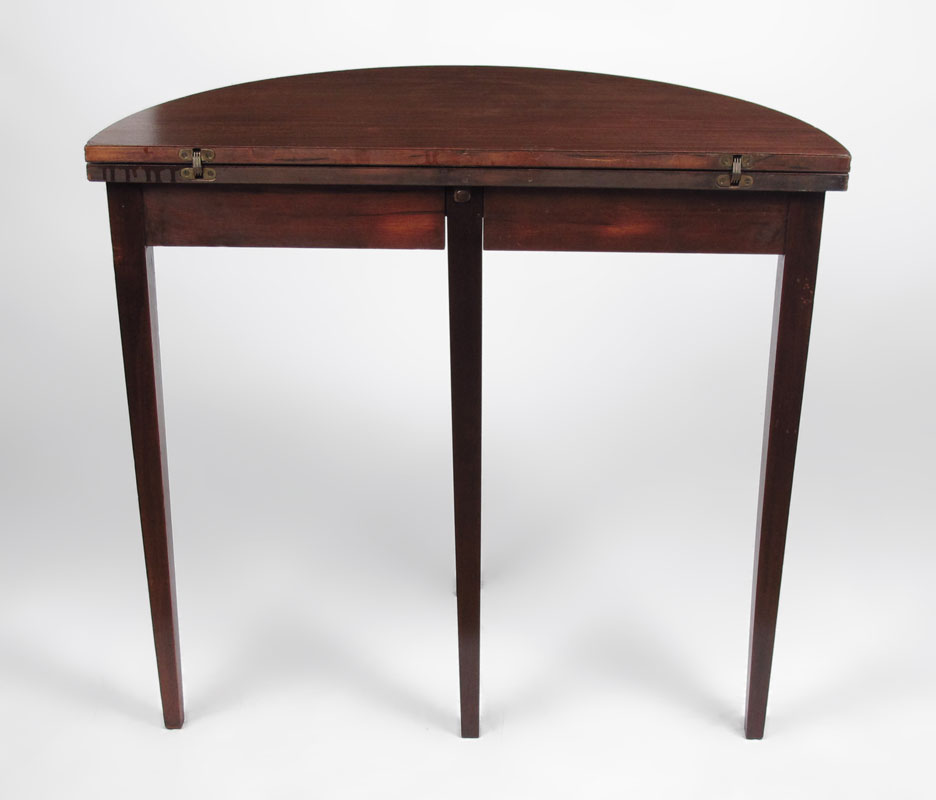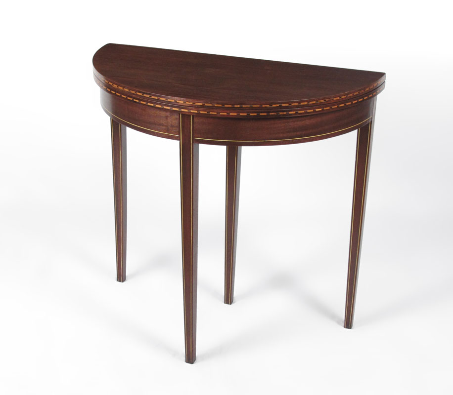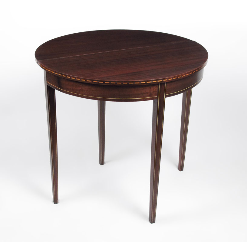 PARQUETRY INLAY MAHOGANY DEMI TABLE: Inlay banding, flip top forms a round table, slender tapered legs. Inlaid edge. Partial labels remain underneath. 30 3/4'' h. x 32'' x 16''.