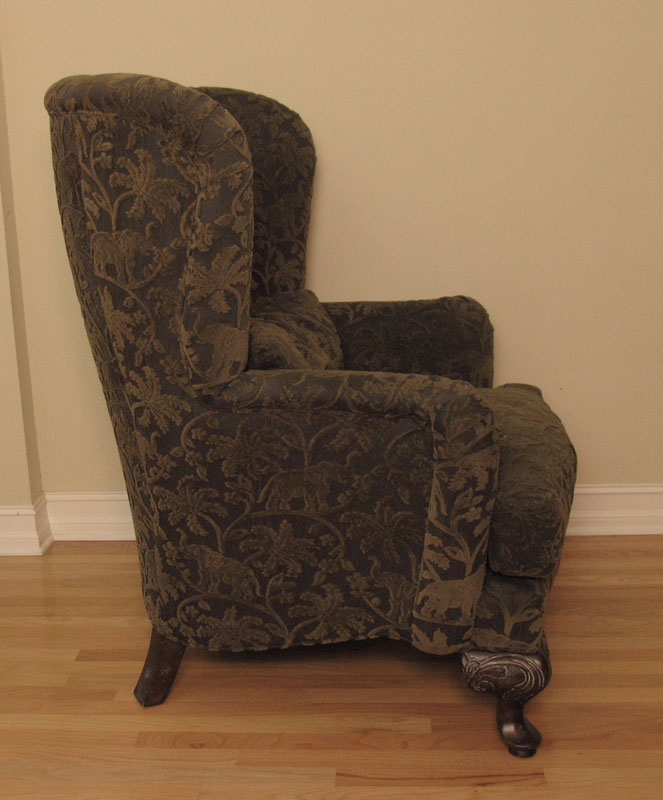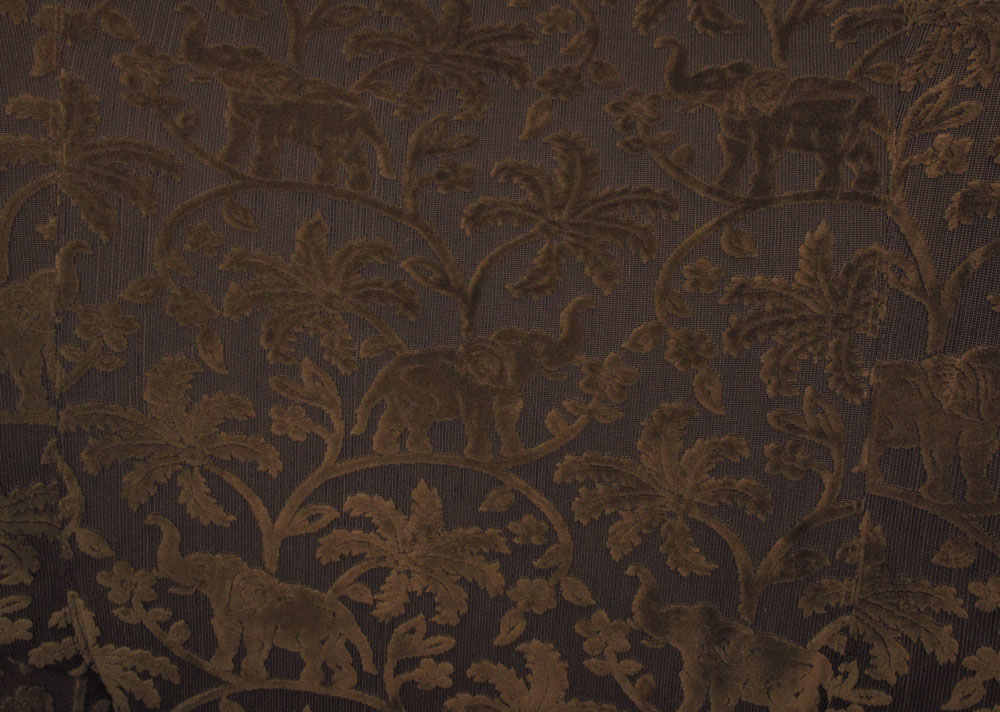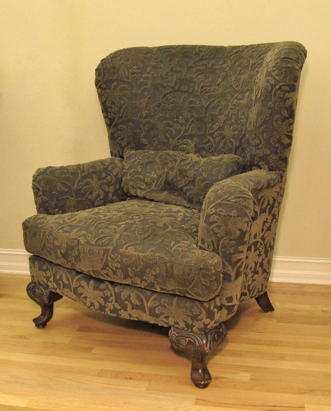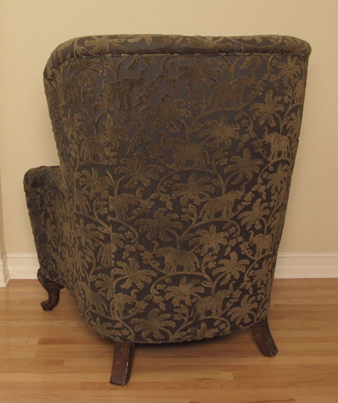 OVER STUFFED BROCADE ELEPHANT MOTIF LOUNGE CHAIR: Textured elephant motif upholstery. Lexington home furnishings. Approx. 46'' h. x 40'' x 40''. CONDITION: Note wear from use.