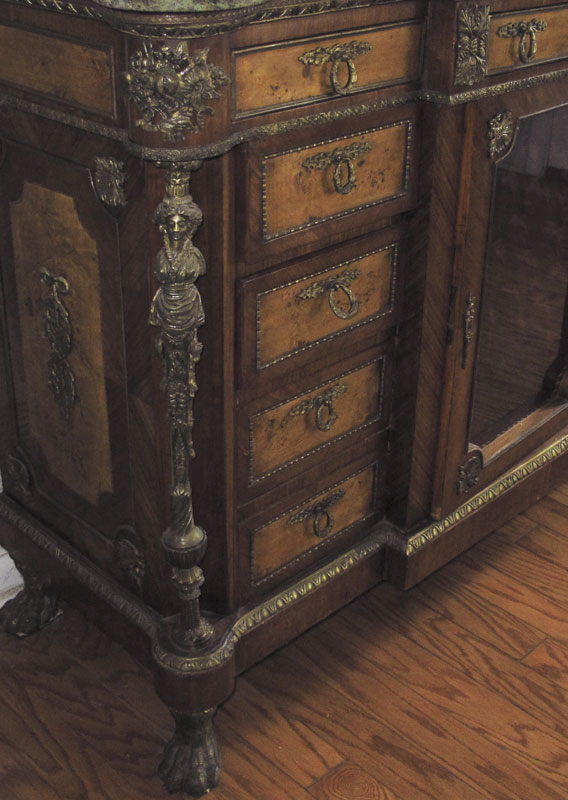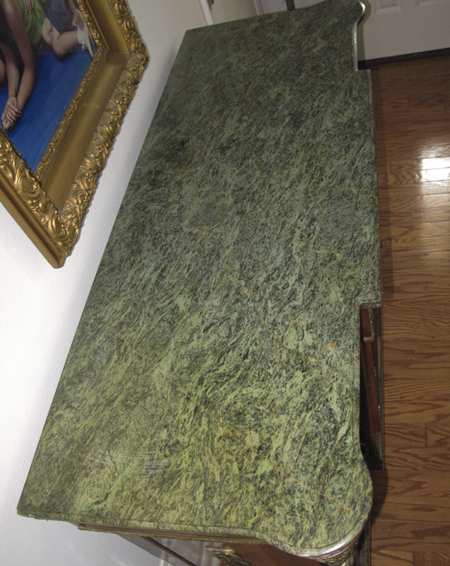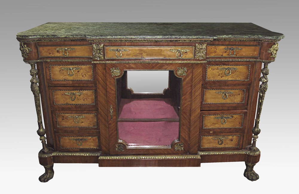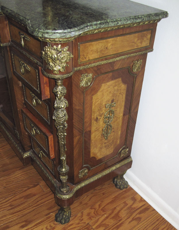 FRENCH STYLE GREEN MARBLE TOP ORMOLU SIDE CABINET: Central glass front door framed by 11 drawers. Interior of the middle section is lined with tufted fabric, and mirror back. Gilt metal ormolu mounts and paw feet. Shaped green marble top. Approx. 37 1/2'' x 52'' x 20''.