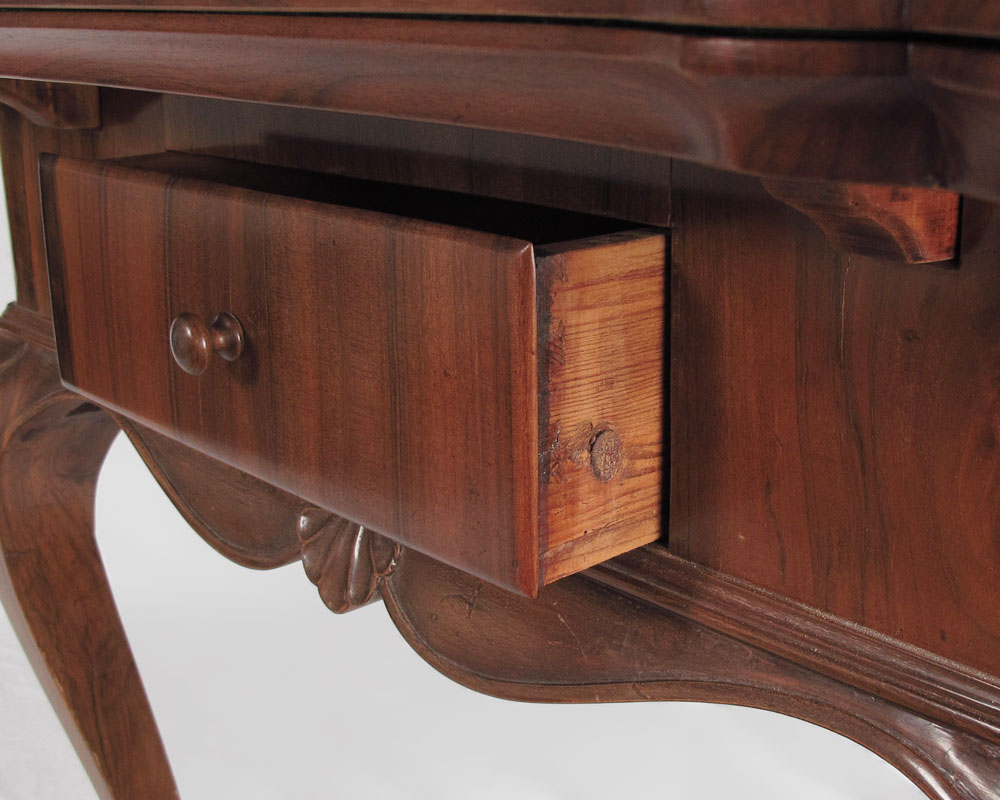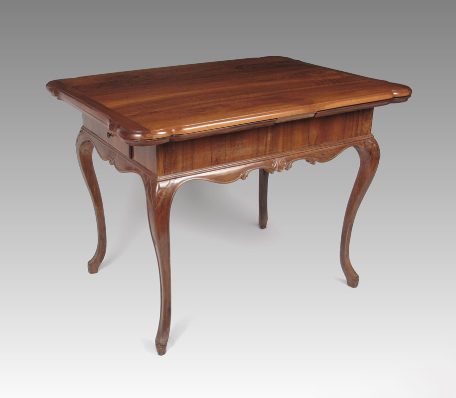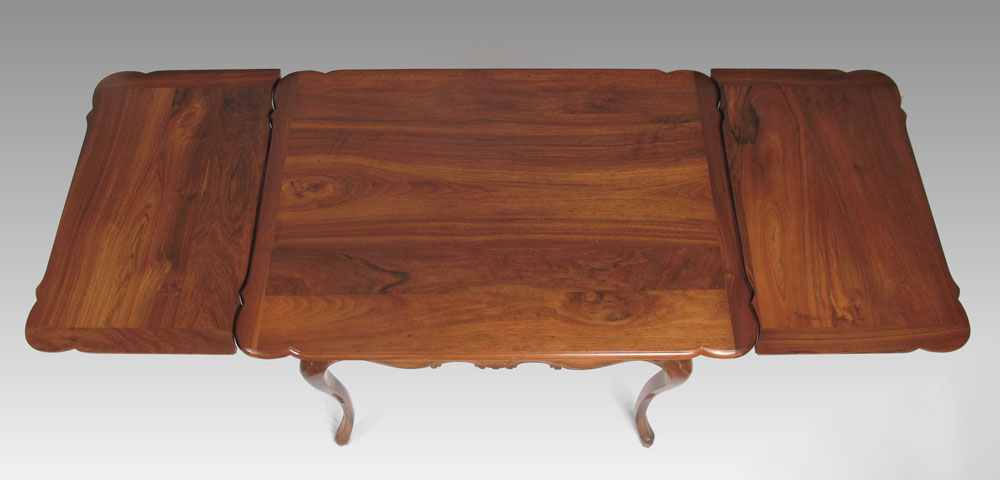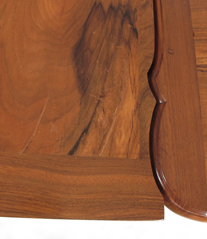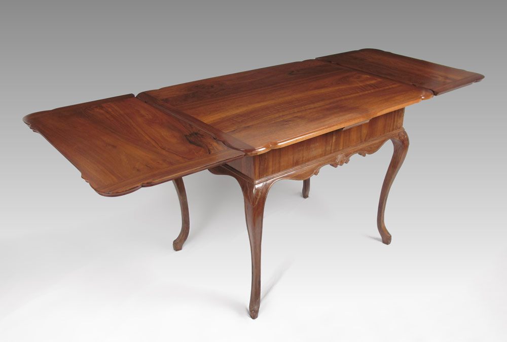 FRENCH 2 DRAWER DRAW LEAF TABLE: Cookie corner draw leaf top over small drawers on either side. Carved apron over carved and shaped legs. 32'' h. x 44'' x 31 1/2''. 80 1/2'' long fully expanded.