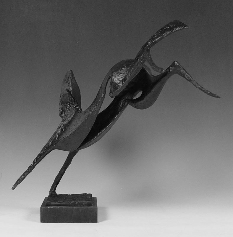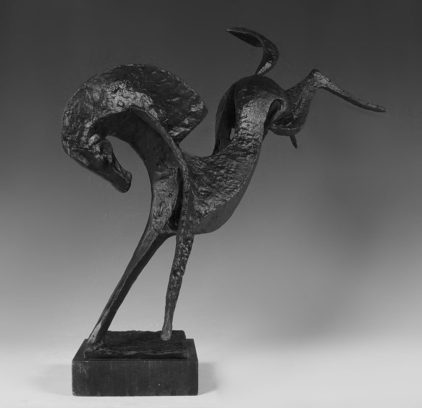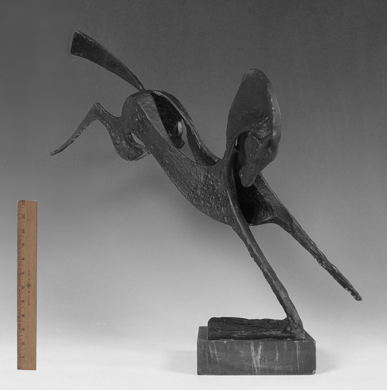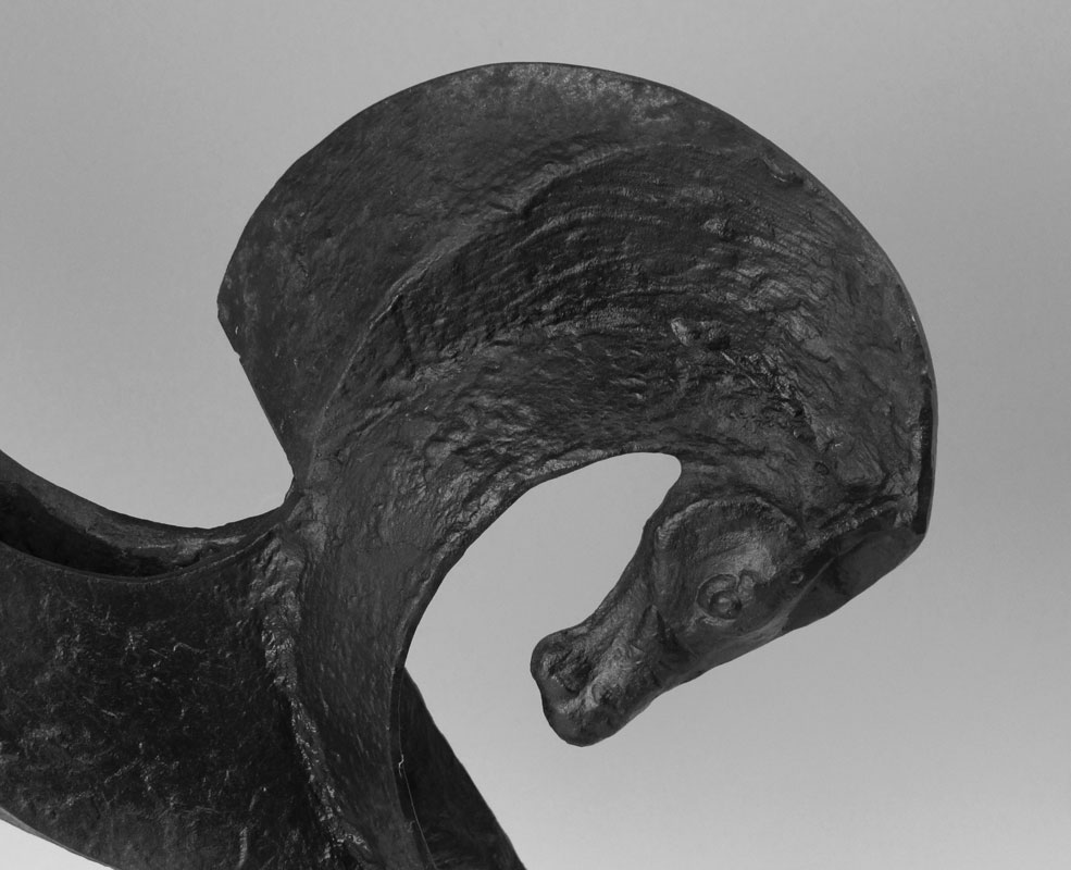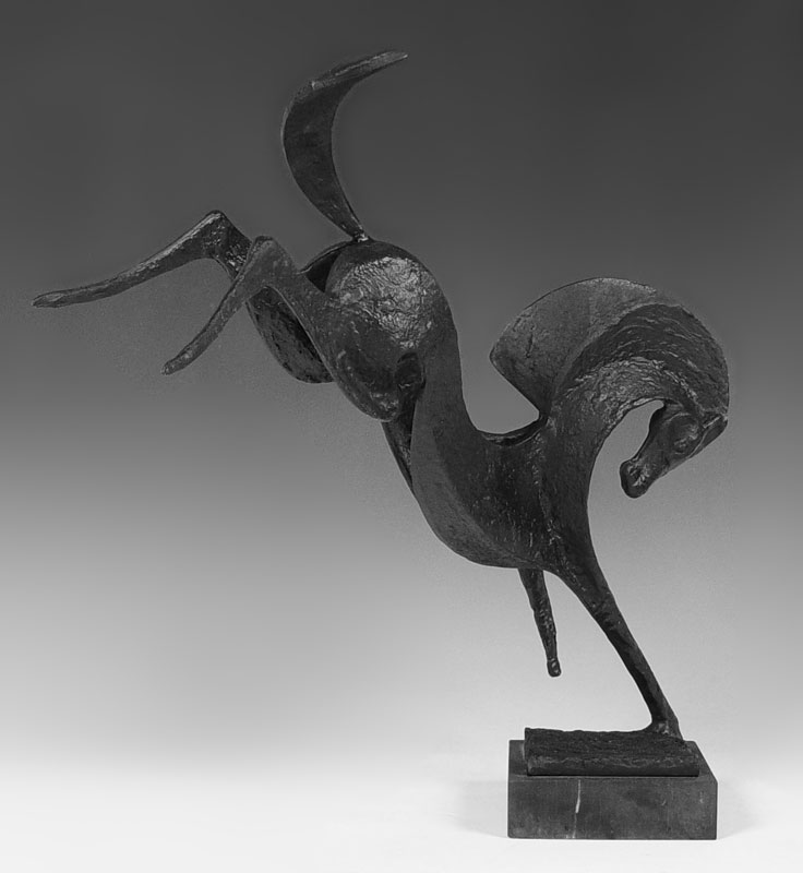 STYLIZED IRON HORSE SCULPTURE: Age and artist unknown, overpainted in black, 24'' h., 24'' w.