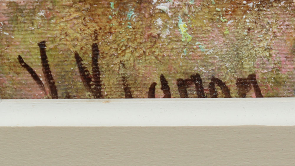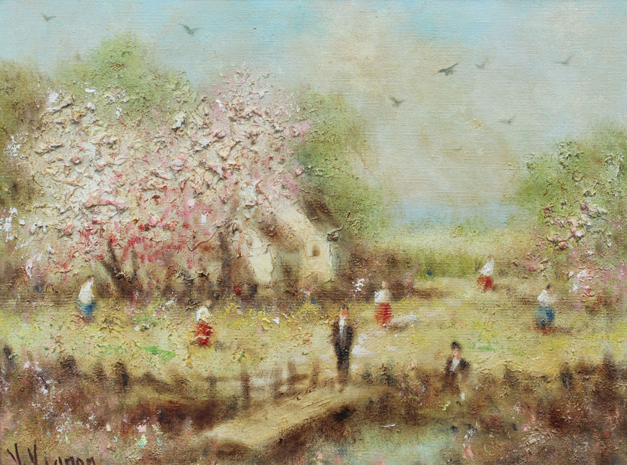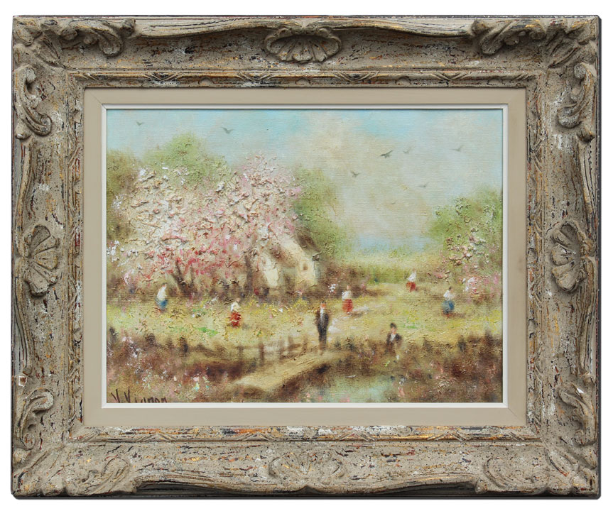 FRENCH LANDSCAPE WITH COTTAGE AND FIGURES: Oil/Canvas, 12'' x 16'', signed lower right, V. VIGNON, encased in carved and painted wood frame, 19'' x 22 1/2''.