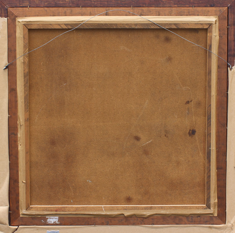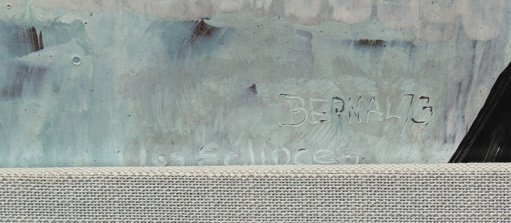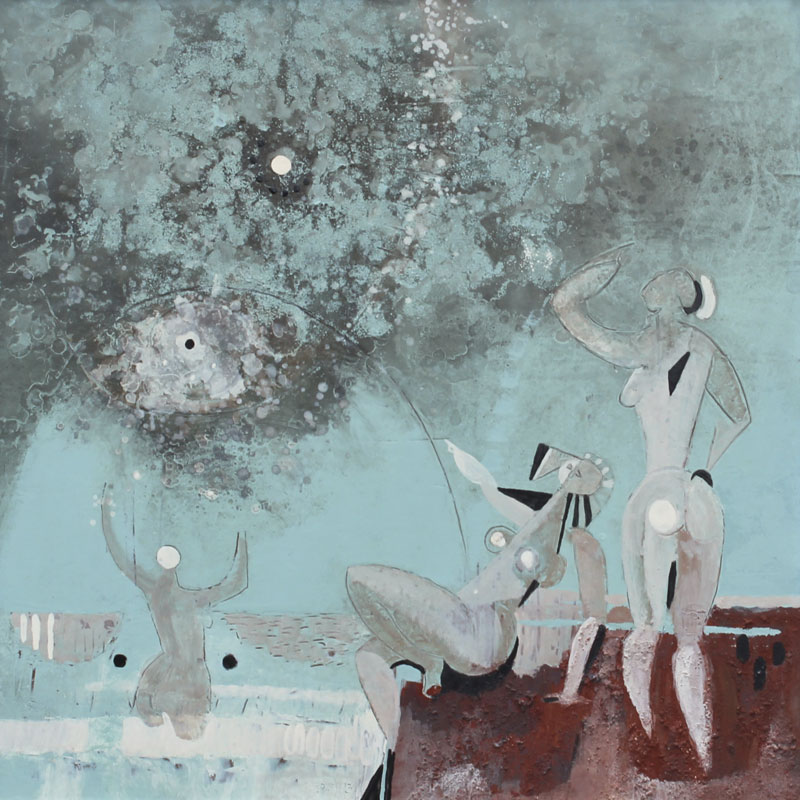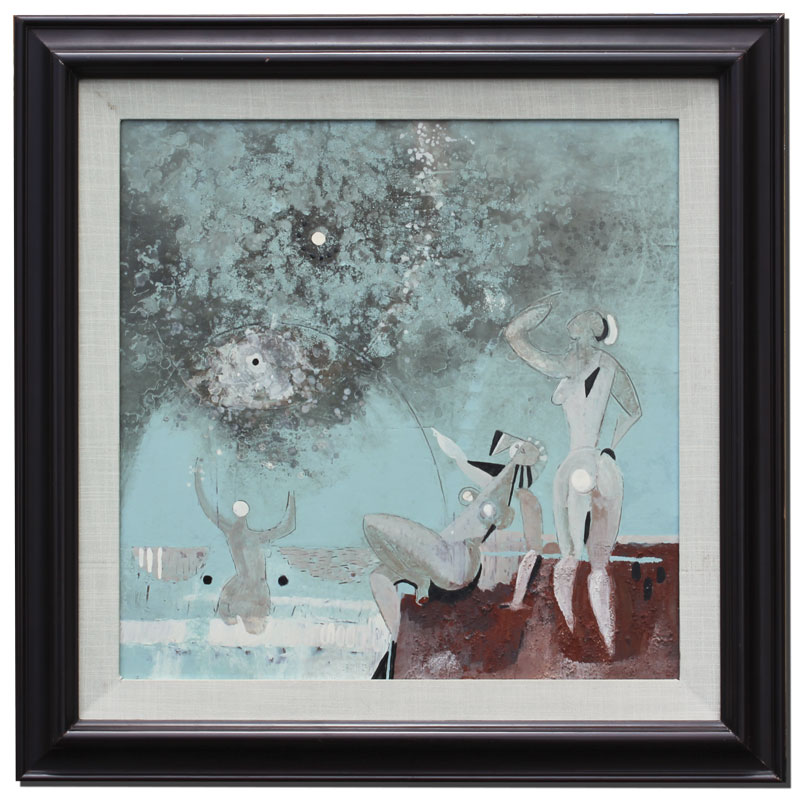 ''LOS ECLIPCES''? SURREAL PAINTING: Depicting three female nudes by the water's edge, Encaustic and Oil with Sgraffitto, sight size 23'' x 23'', signed 'BERNAL' and dated '73, wooden frame, 32'' x 32''.
