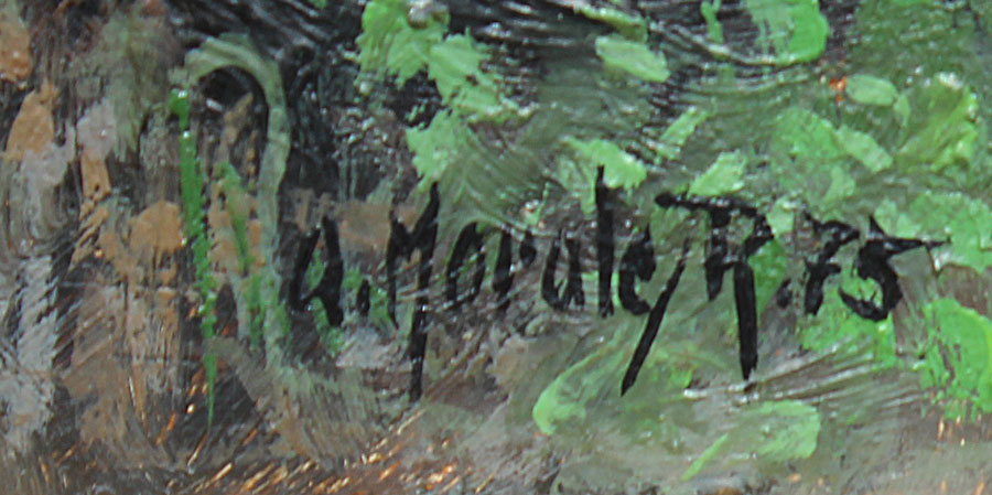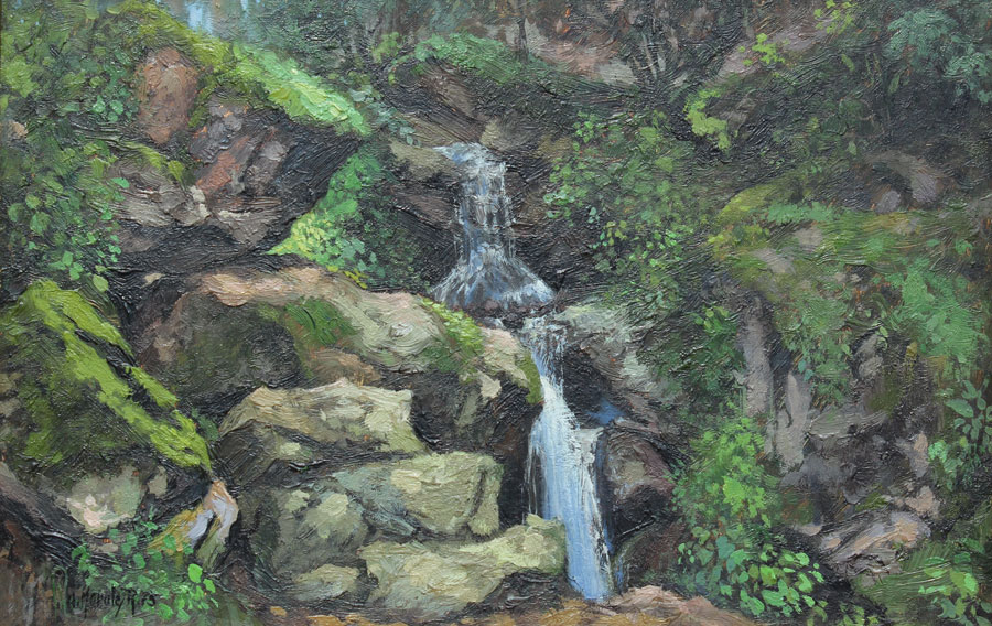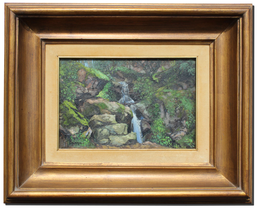 MORALES, A.,(Mexican, 20th C.): Cascading Waterfall in Lush Green Jungle Landscape, Oil/Board, 8'' x 12'', signed lower right and dated '75, encased in gilded wood frame, 17 1/2'' x 21 1/2''.