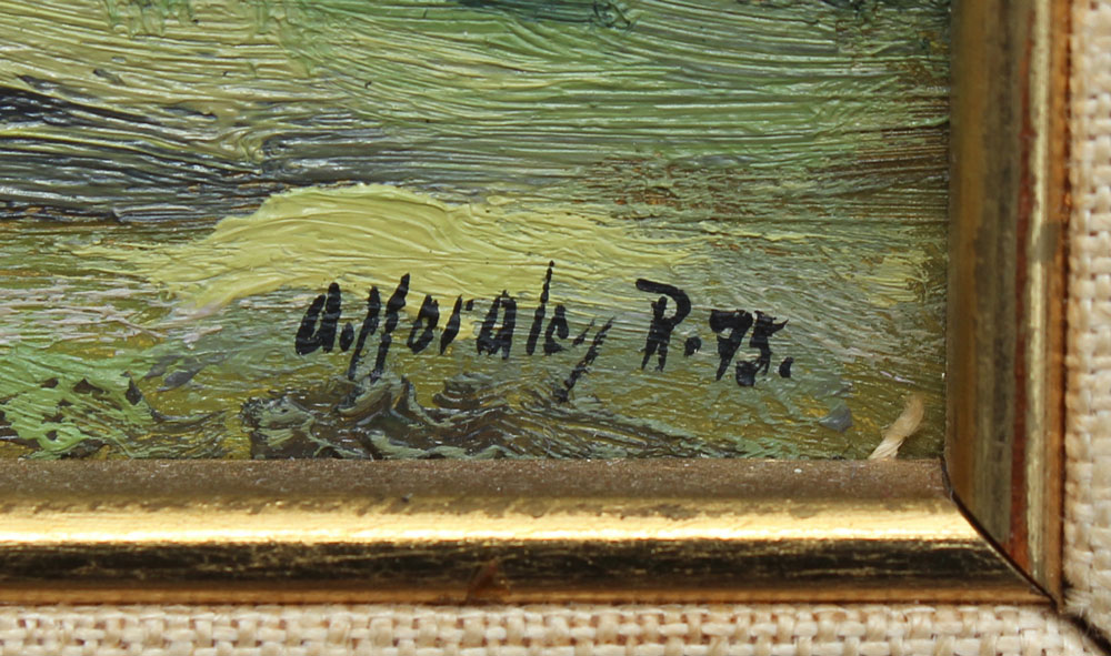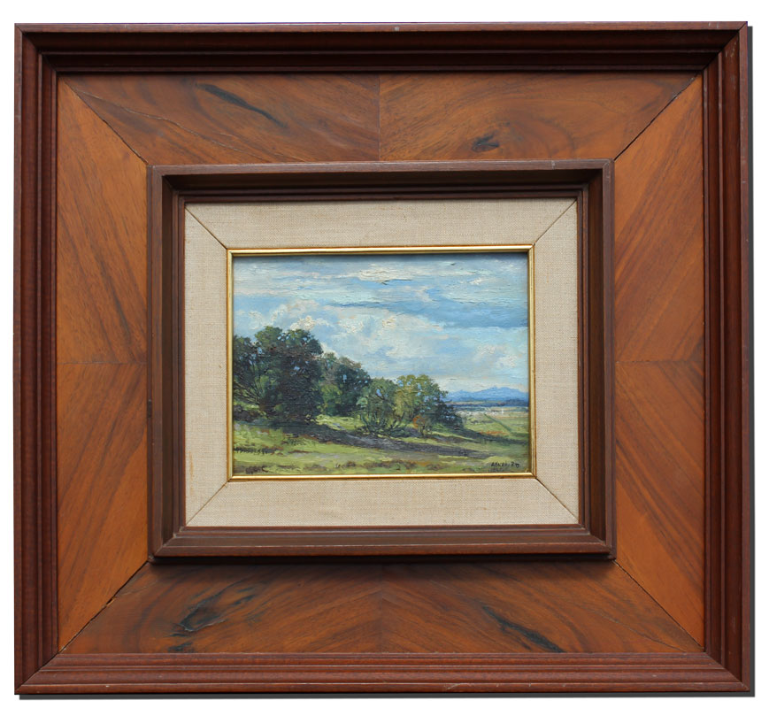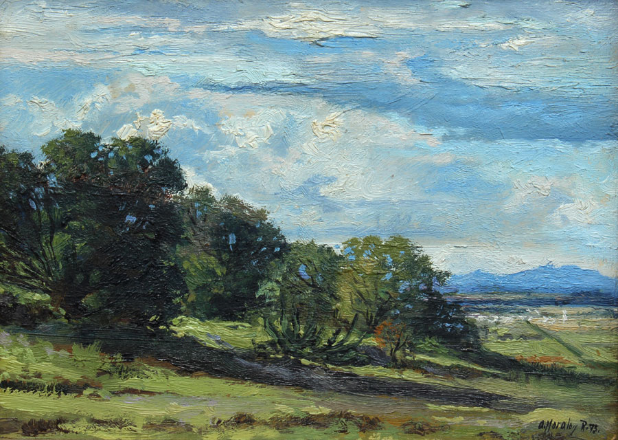 MORALES, A.,(Mexican, 20th C.): Pastoral Landscape With Village in the Far Distance, Oil/Copper, 5 7/8'' x 7 7/8'', signed lower right and dated '75, encased in a walnut veneered frame, 16 1/2'' x 18 1/2''