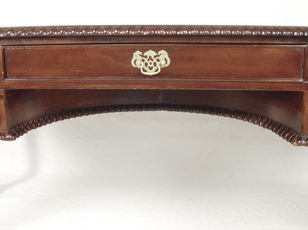 CHIPPENDALE STYLE WRITING TABLE: Mahogany writing table with gadroon edging, cabriole legs, ball and claw feet. 5 drawers. 30'' tall x 65'' x 35''.