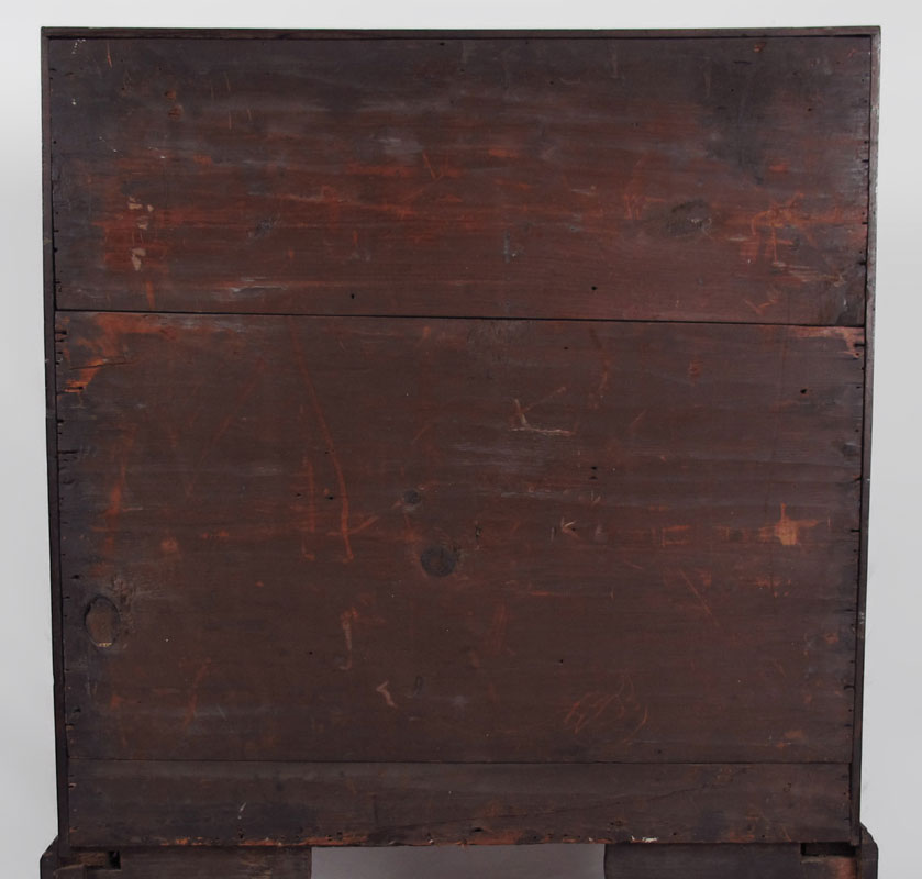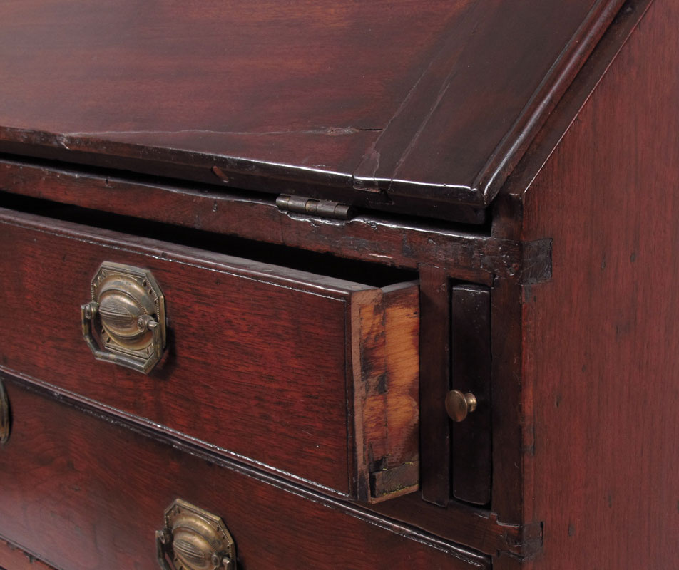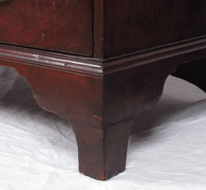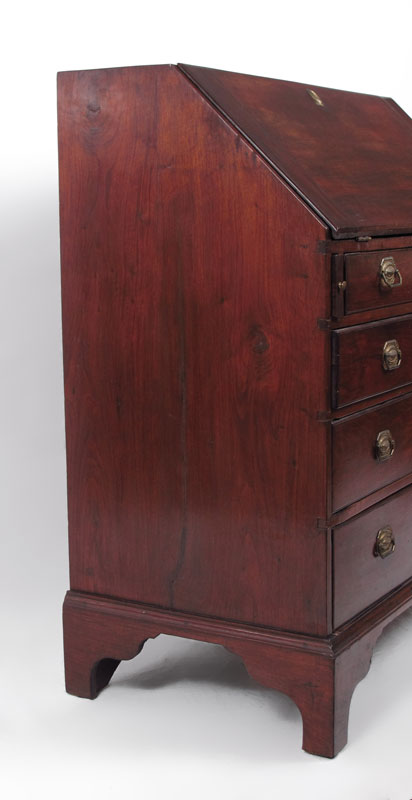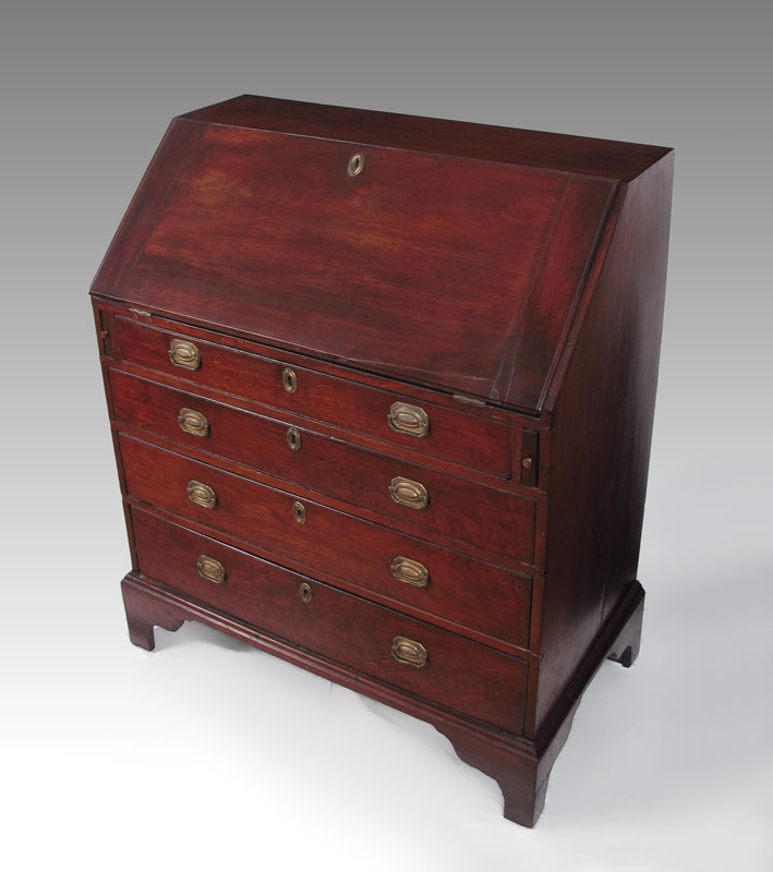 PERIOD CHIPPENDALE MAHOGANY SLANT FRONT DESK: Circa 1750's-1770's. Interior of nine pigeon holes with shaped dividers and 9 small drawers. The central panel covers drawers and pigeon holes. Straight front with four graduated drawers.Protruding base, bracket feet. 43'' h. x 36'' x 21''.