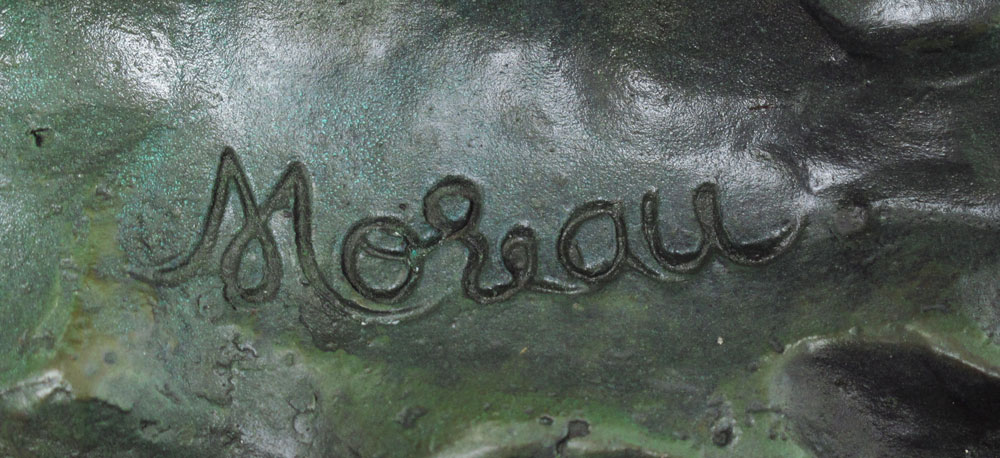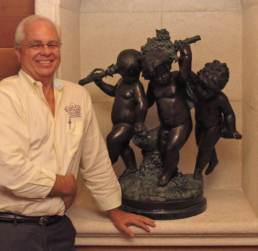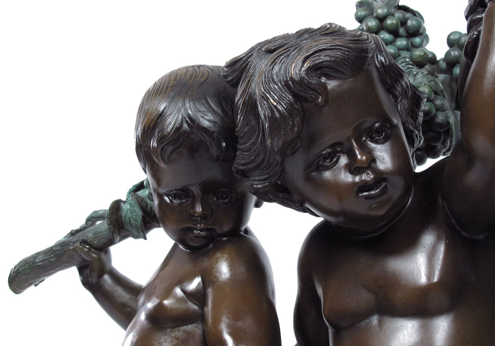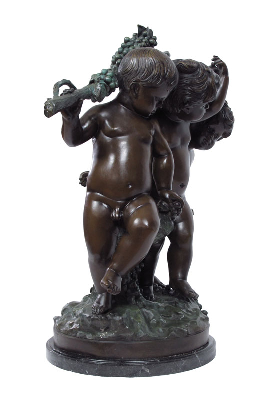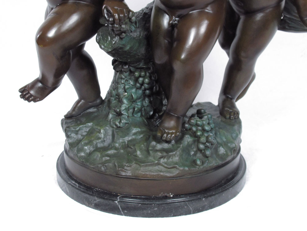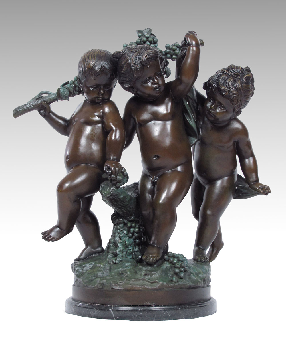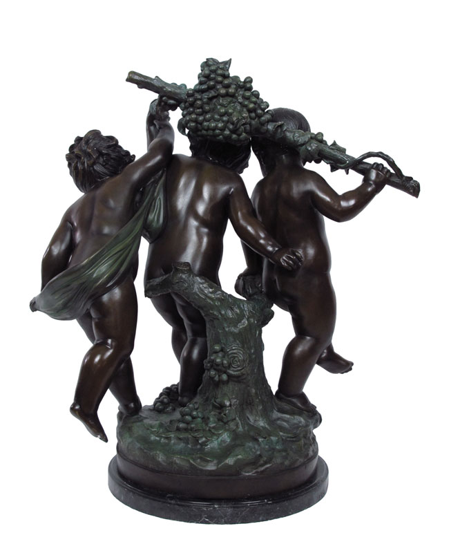 THREE FIGURE CHERUBIC BRONZE BACCHIC SCULPTURE AFTER MOREAU: 3 Cherubic Figures Toting Grape Vine, Frolicking, 31'' h., affixed to marble plinth, 33'' overall, 30'' w.