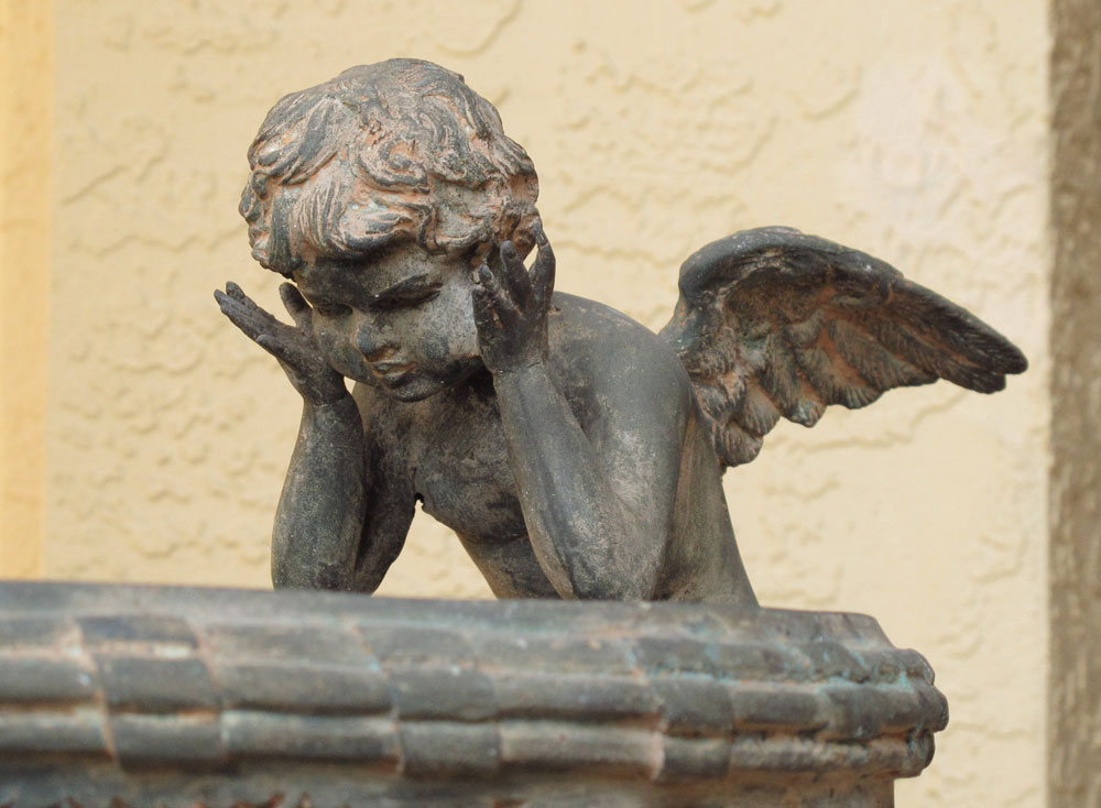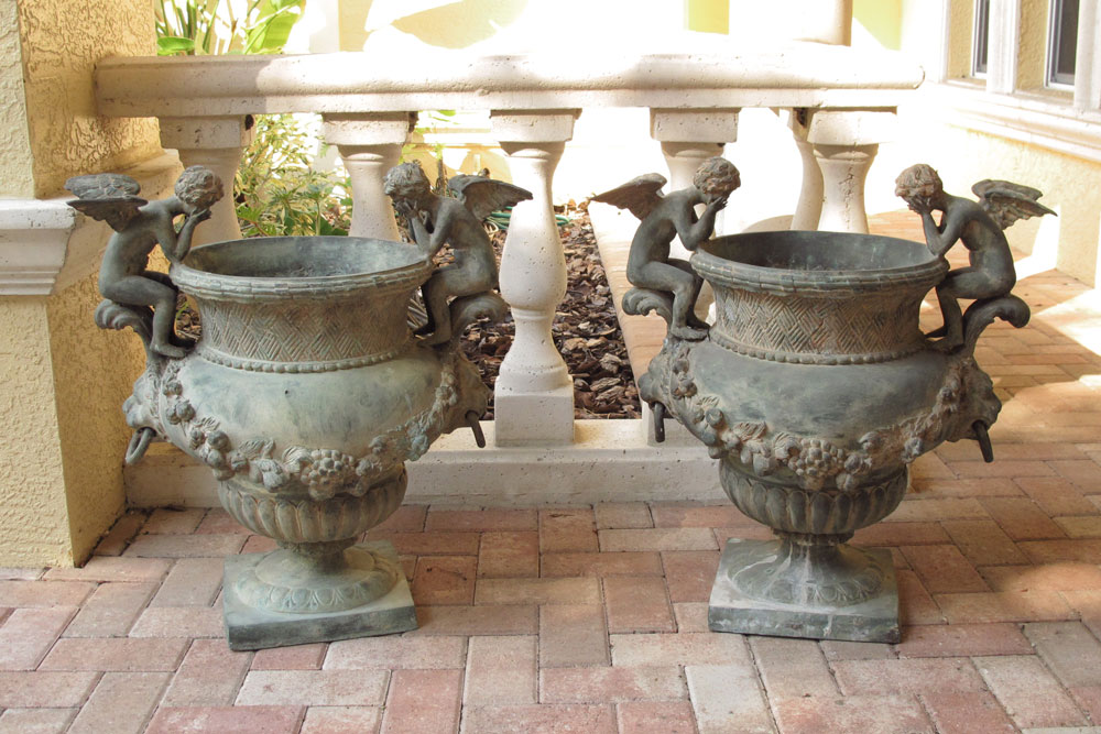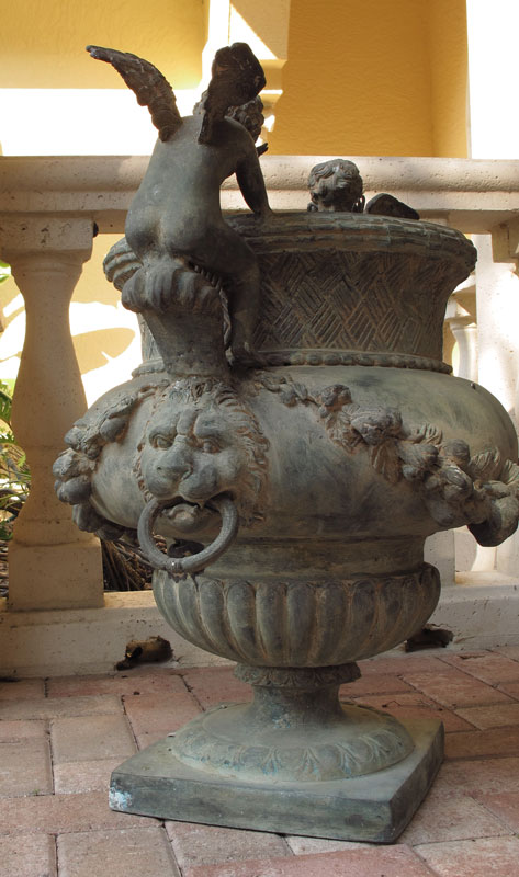 PAIR OF CONTEMPORARY BRONZE CHERUBIC GARDEN URNS: 27 1/4'' h. x 25 1/4''.