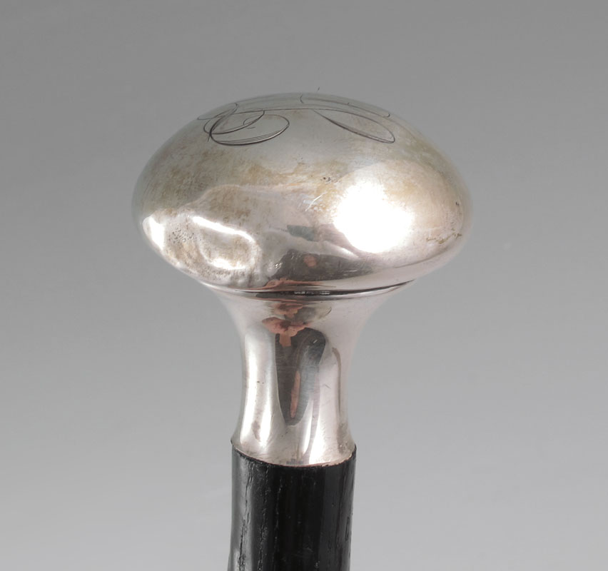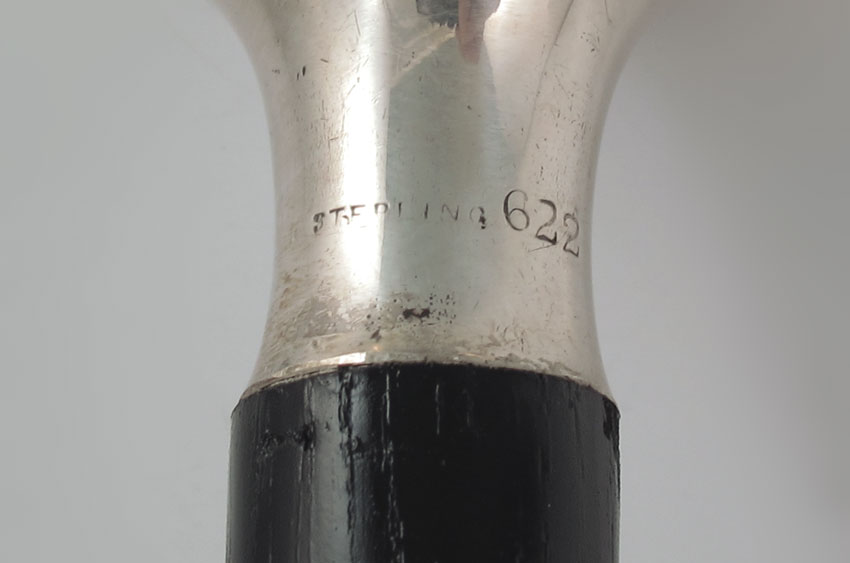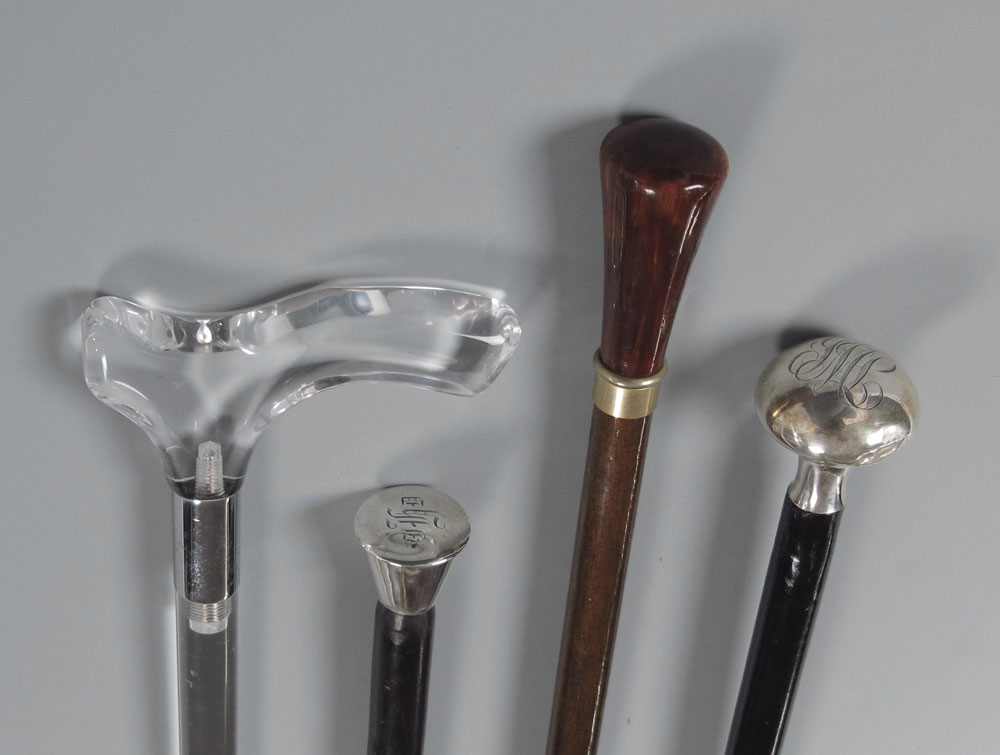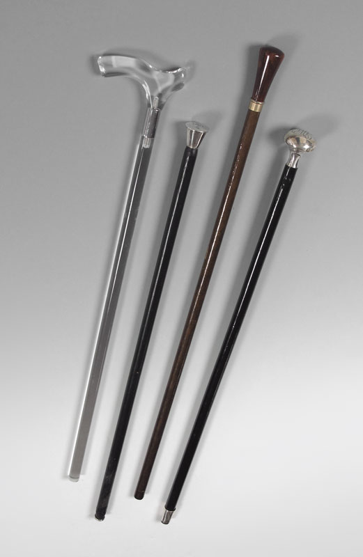 COLLECTION OF 4 WALKING STICKS: To include 1) Lucite cane, missing tip, 32 1/2'' l. 2) Monogrammed sterling handle with black painted shaft, metal tip. 39 3/4'' l. Note dent and dings to handle, dings to shaft. 3) Monogrammed sterling handle with black painted shaft, metal ring tip, 33'' l. Note dings to handle and shaft. 4) Mottled plastic handle with wood shaft, no tip. Note dings and scrapes all over. 35 3/4'' l.