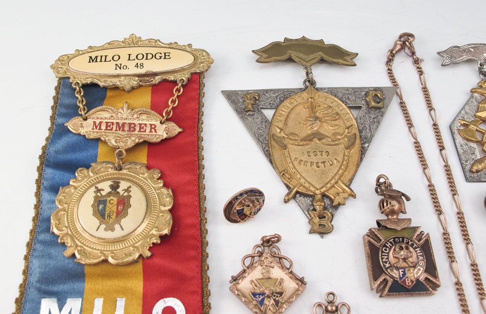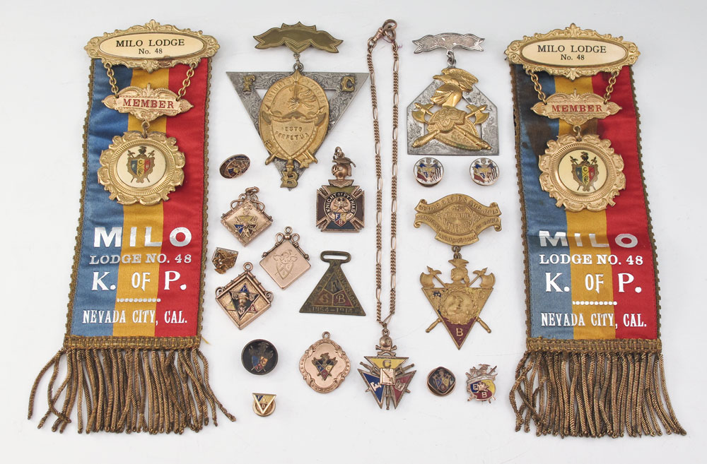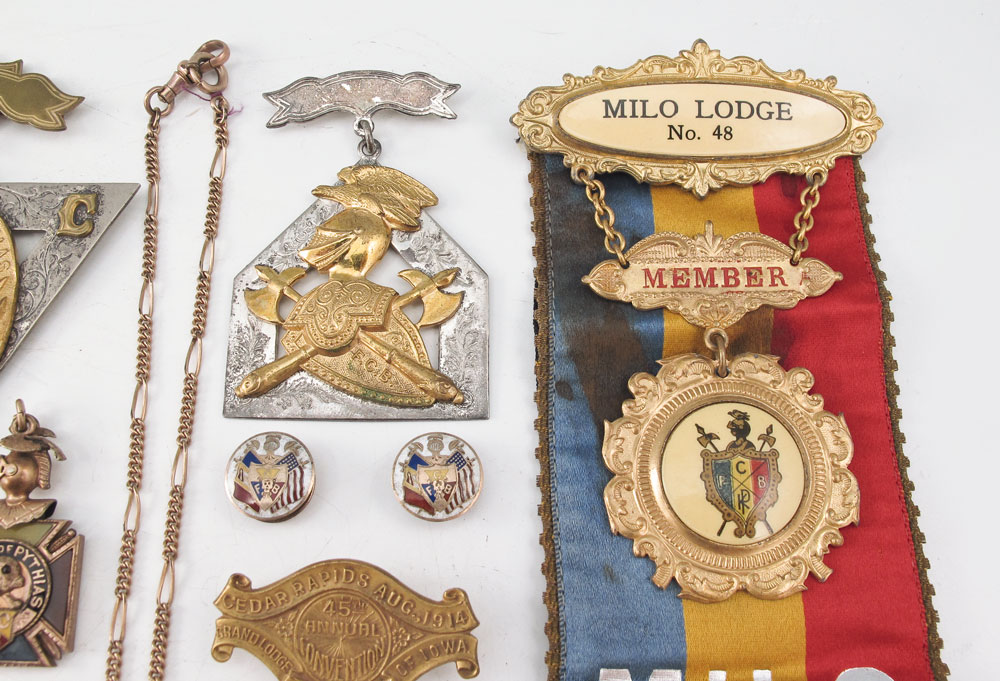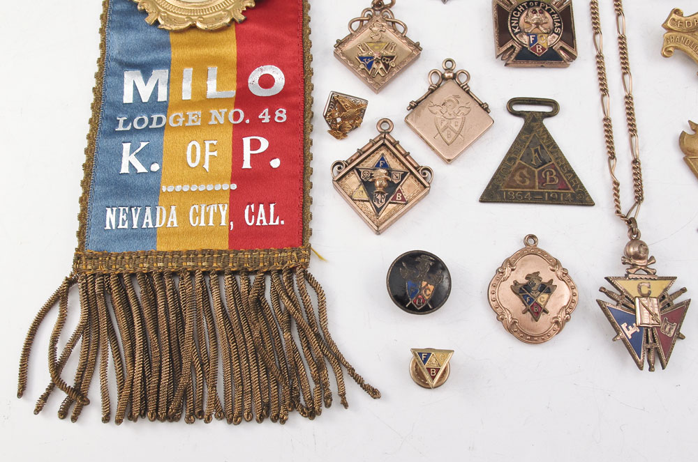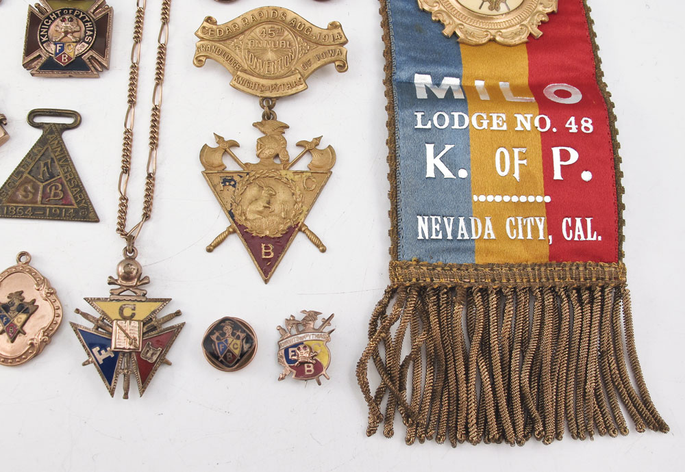 NICE COLLECTION OF FRATERNAL MEDALS: Approx. 20 Knights of Pythias medals, ribbons, pendants and pin backs. Dates range from early 20th century to more modern pieces. Largest ribbon measures 9'' long.