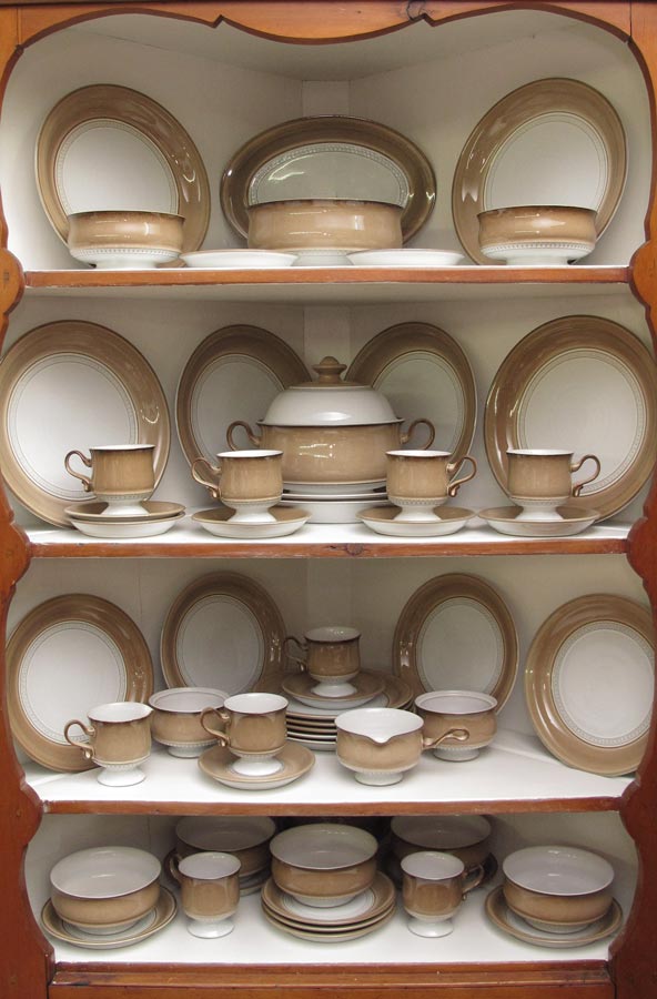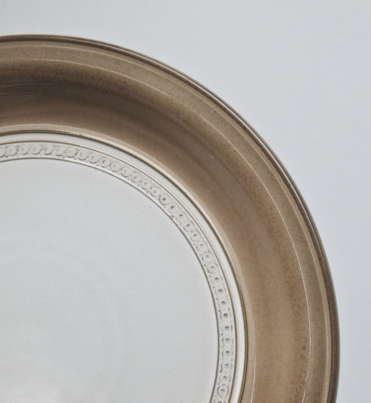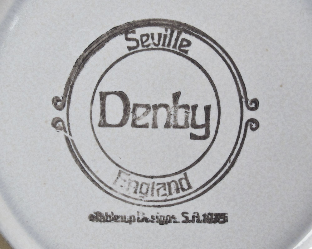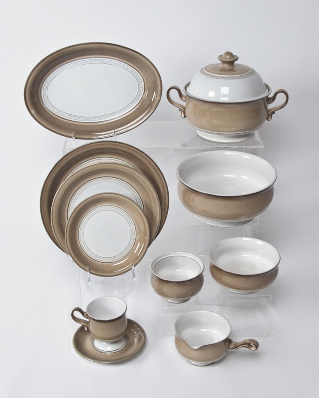 DENBY ENGLISH STONEWARE CHINA IN THE SEVILLE PATTERN: 48 piece service for 8 to include 8 dinner plates (10.5''), 9 salad plates, 8 soup bowls, 8 bread plates, 8 footed cups and 8 saucers. Serving pieces include the large covered casserole, round open vegetable, platter, 2 open sugar (no lids), creamer, and gravy with handle.