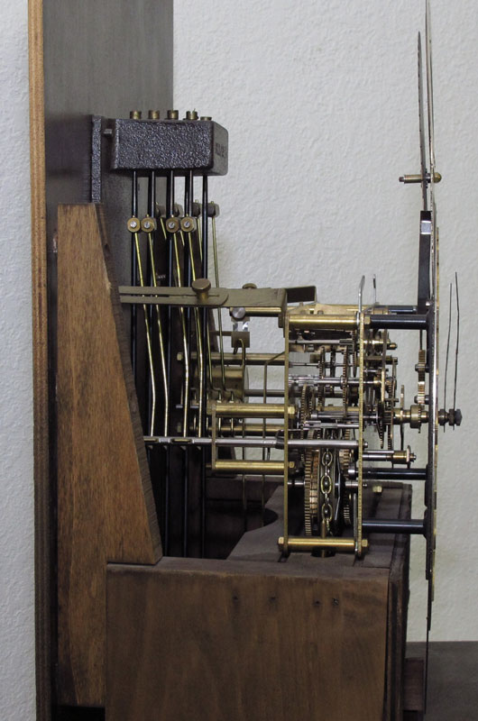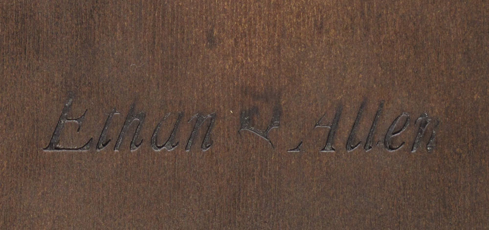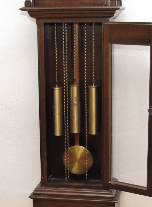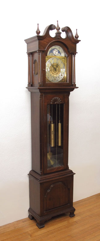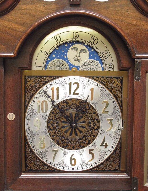 ETHAN ALLAN MOONPHASE GRANDFATHER CLOCK: Broken arch pediment with applied carved decoration and spire finials. Turned full column supports on hood. Mixed metal face with moon phase. Weight driven movement with silent and chime. 84'' h. x 20'' x 11''