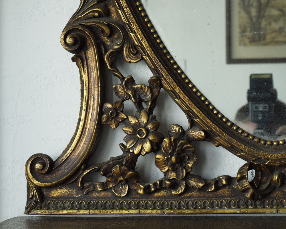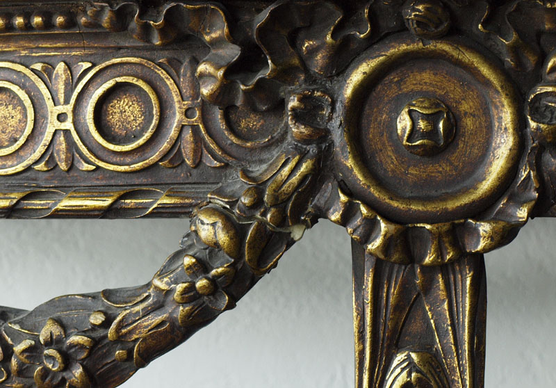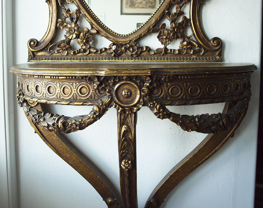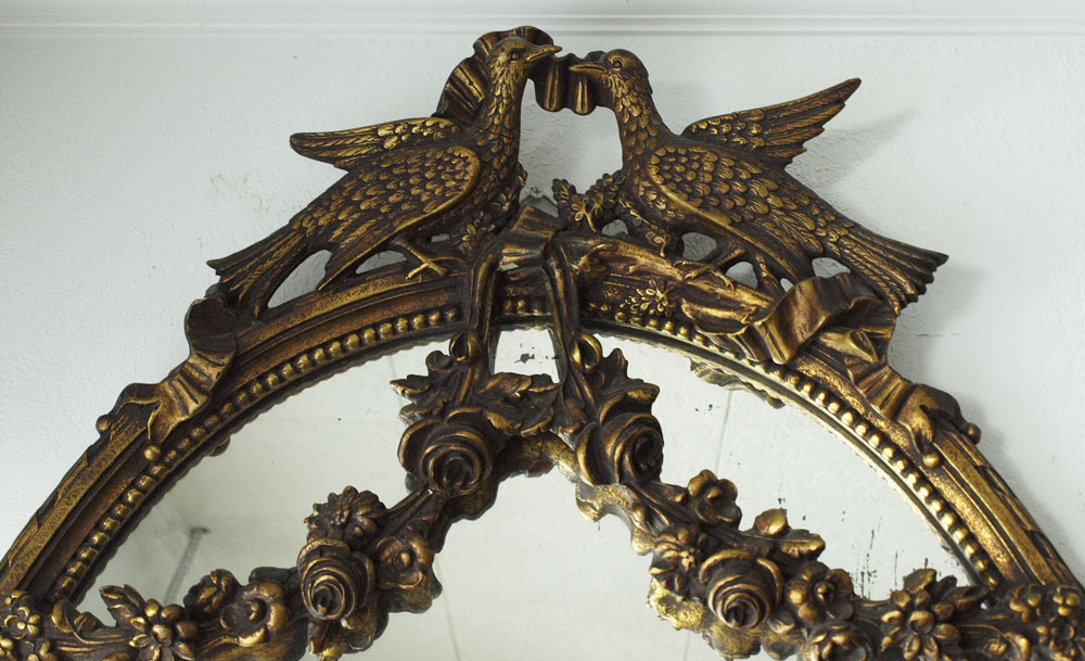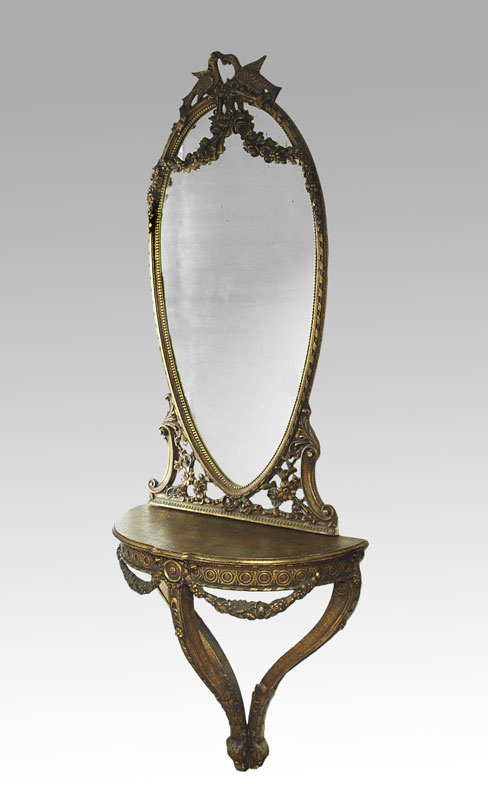 ITALIAN GILT CONSOLE TABLE AND MIRROR: Two part decorative table and mirror, 34 3/4''h. x 36''w. x 16''d. wall mount demi table under oval mirror surmounted by love birds. Overall height approx. 7'8''.