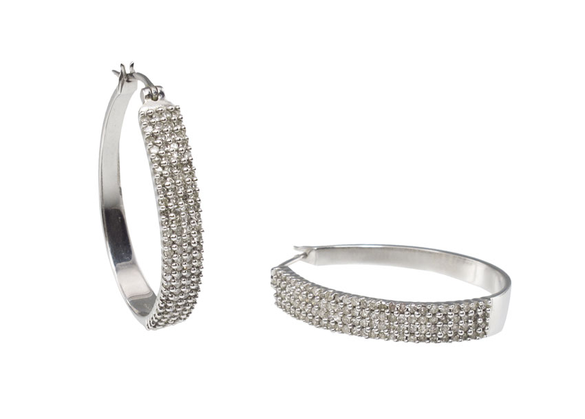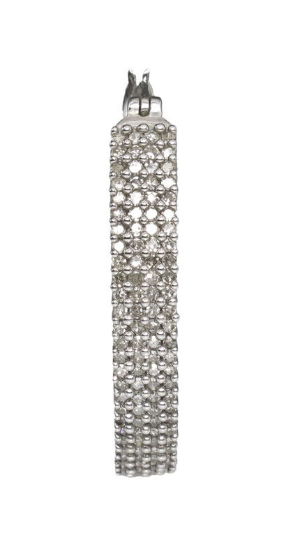 14K DIAMOND HOOP EARRINGS: 14K white gold hoop earrings contain approx. 2.0 Ctw of 208 round single cut diamonds, averaging SI in clarity and H-I-J in color. The diamonds are prong set. Length 1.5''. Weight: 11.6 grams.