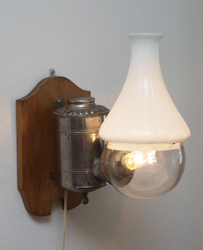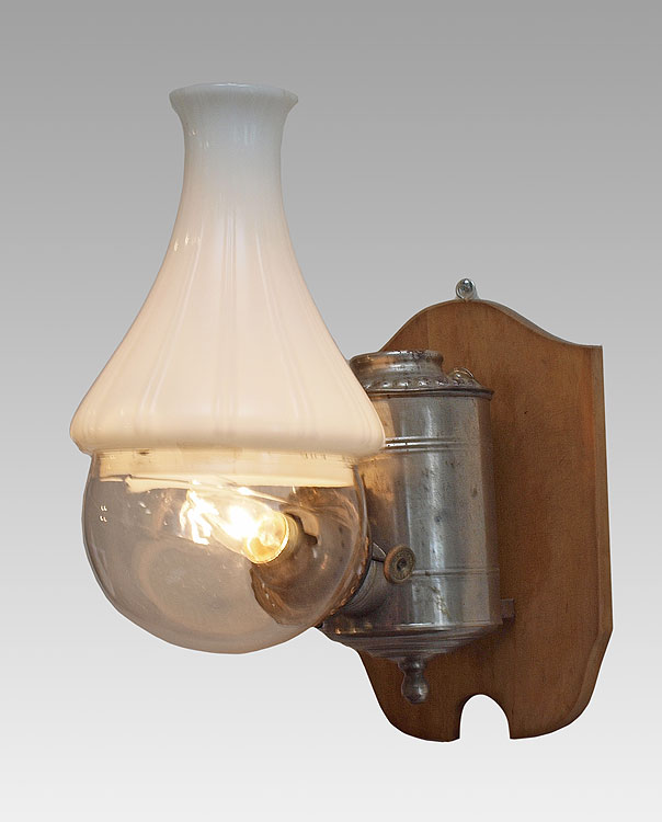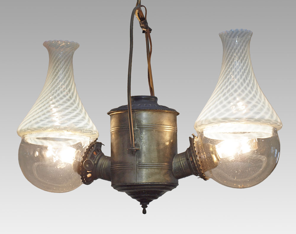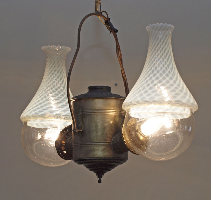 2 PIECE ANGLE LAMP COMPANY LAMPS: Both have been converted to electricity to include 1) Hanging double font with swirl glass shades. Overall 17 1/2'' h. x 21'' x 8 3/4''. 2) Wall mounted single font affixed to wooden plaque, overall 16'' h. x 8'' x 15''.