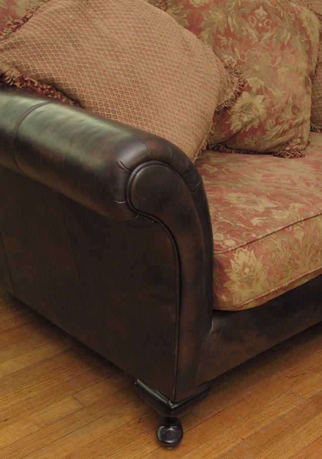 BERNHARDT LEATHER LOVE SEAT: Leather covered frame with red and gold colored fabric cushions and back. Approx. 29 1/2'' h. x 89'''' x 41 1/2''. See matching sofa previous lot 229.