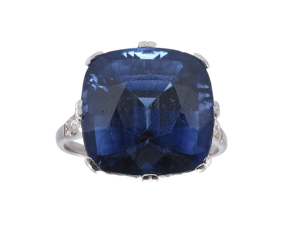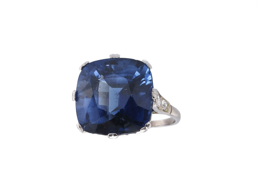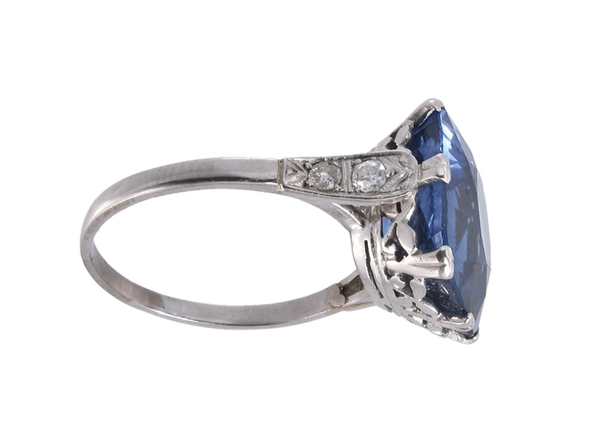 PLATINUM SAPPHIRE AND DIAMOND RING: Platinum ring centers a 10 Ct. synthetic sapphire, the shank is accented with 3 old mine cut diamonds, approx. .009 Ctw. and a later replaced imitation diamond.