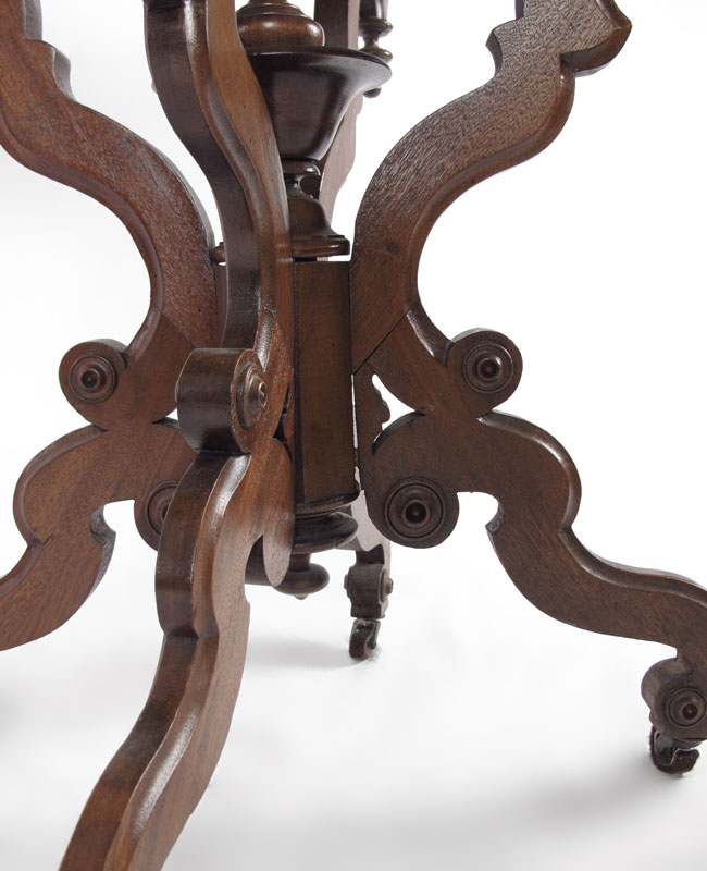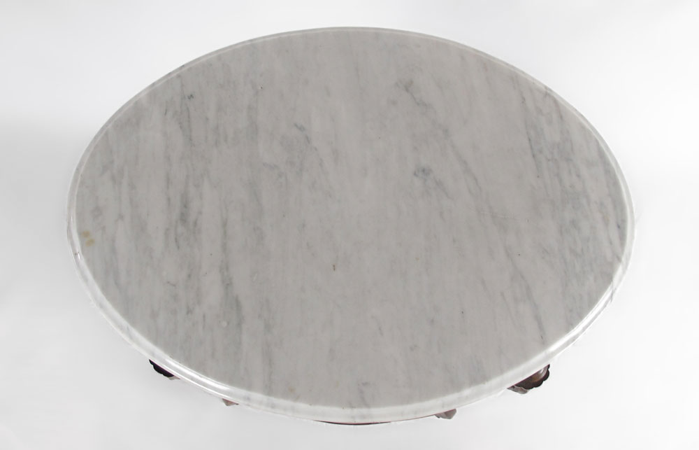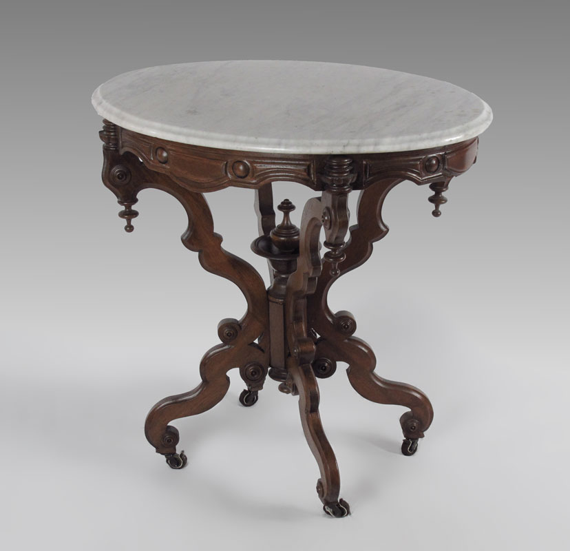 VICTORIAN MARBLE TOP LAMP TABLE: White oval marble top over center urn shaped pedestal and shaped legs. approx. 28 1/2'' x 30'' x 22''.