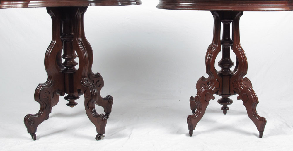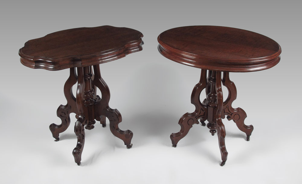 TWO VICTORIAN WALNUT SIDE TABLES: 1) Oval top, shaped legs and pedestal, 29'h. x 30 1/2''. 2) Shaped and stepped top, 30'' tall x 31 1/2'' x 22''.