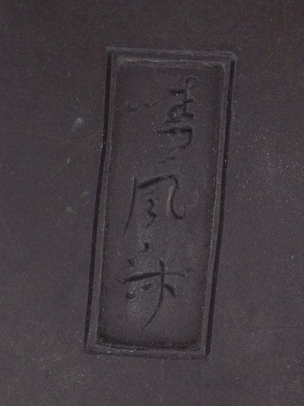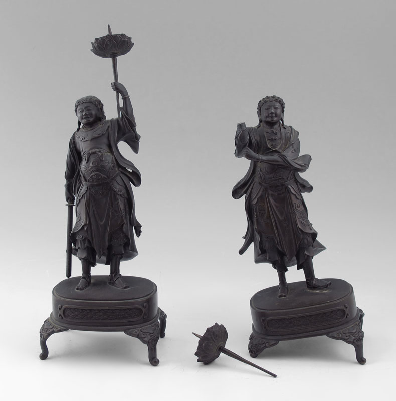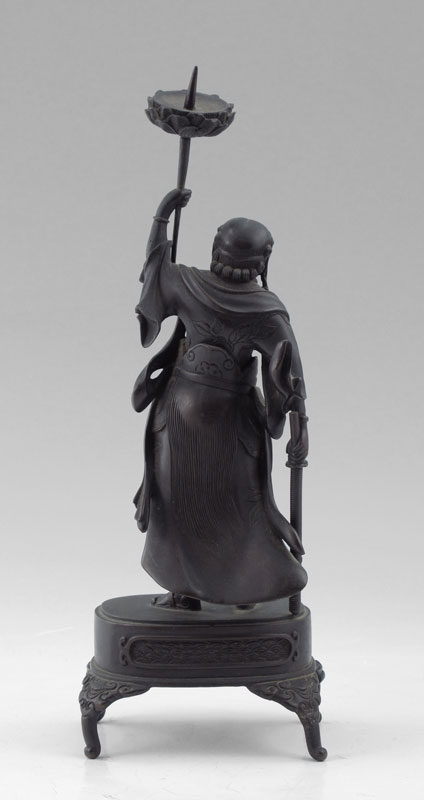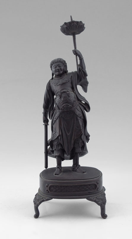 SIGNED ORIENTAL BRONZE WARRIOR FIGURAL CANDLESTICK: Superbly modeled figure of a smiling warrior with sword in hand and candle holder resembling a torch in the other, 9 1/2'' h, signed to the base of the platform that the figure is standing on, probably 19th or early 20th C.